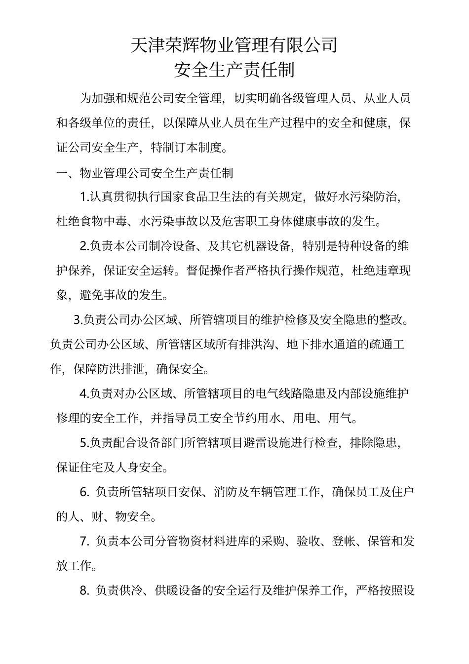 天津荣辉物业管理有限公司安全生产责任制为加强和规范公司安全管理,切实明确各级管理人员、从业人员和各级单位的责任,以保障从业人员在生产过程中的安全和健康,保证公司安全生产,特制订本制度。一、物业管理...