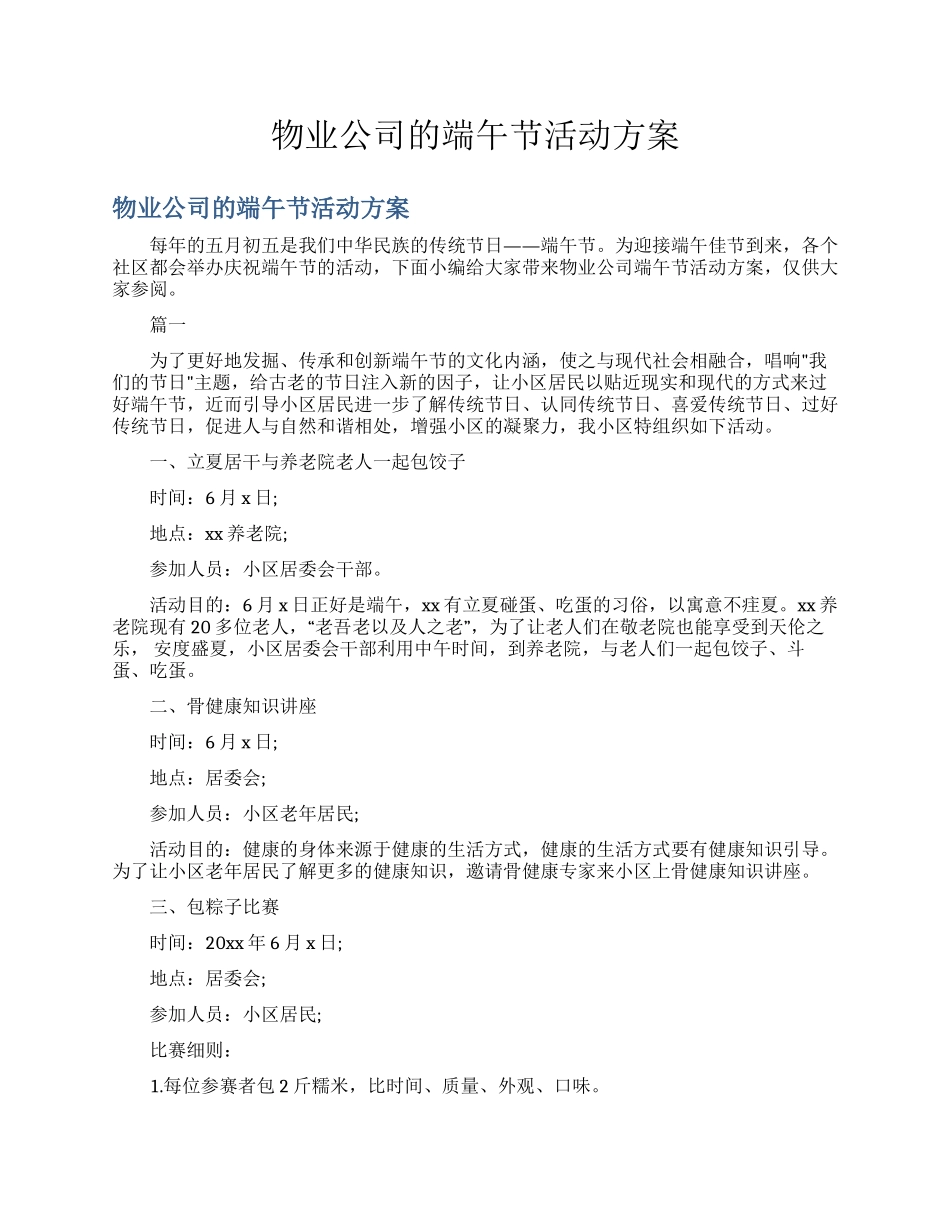 物业公司的端午节活动方案物业公司的端午节活动方案——每年的五月初五是我们中华民族的传统节日端午节。为迎接端午佳节到来,各个社区都会举办庆祝端午节的活动,下面小编给大家带来物业公司端午节活动方案,仅...