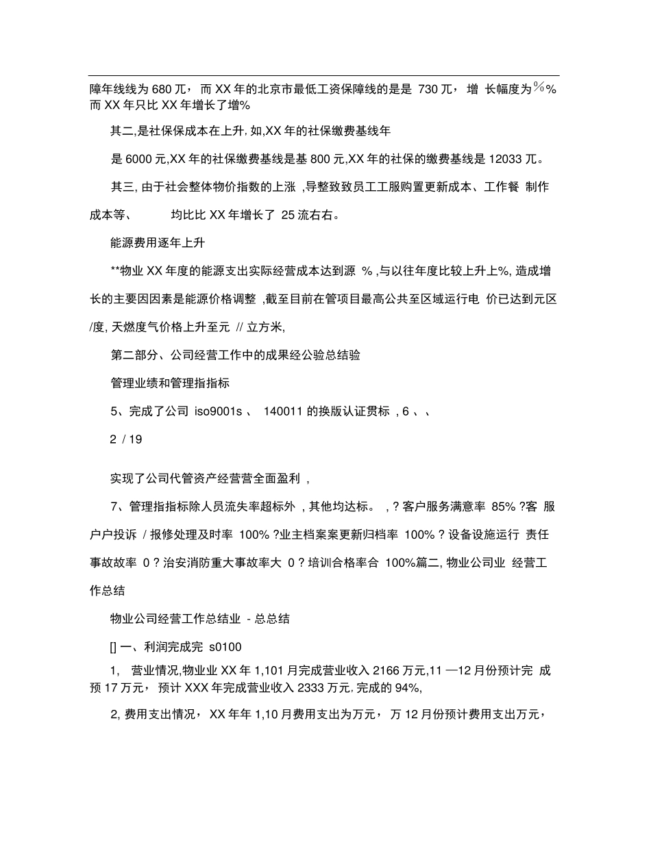 物业公司经营情况报告物业公司经营情况报告篇一,物业管理业绩及经营情况报告XX年度**物业管理有限公司工作总结、,、-前言第一部分、年度经营工作年度经营计划、各项经营指标完成情况XX年度**项目全面完成总公司下...