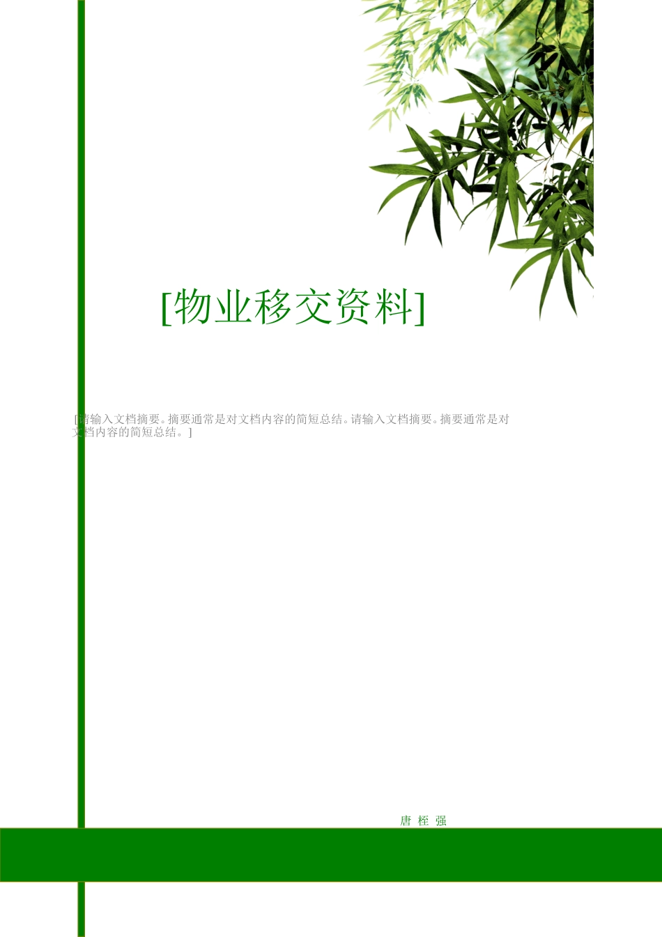 唐桎强1[物业移交资料][请输入文档摘要。摘要通常是对文档内容的简短总结。请输入文档摘要。摘要通常是对文档内容的简短总结。]物业管理有限公司物业交接目录序号资料名称备注1物业移交验收表2房屋及公用设施等移...