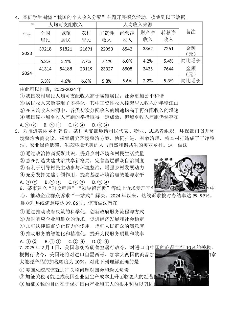 2025届山东省青岛市高三下学期第一次适应性检测政治试题含答案.docx_第3页