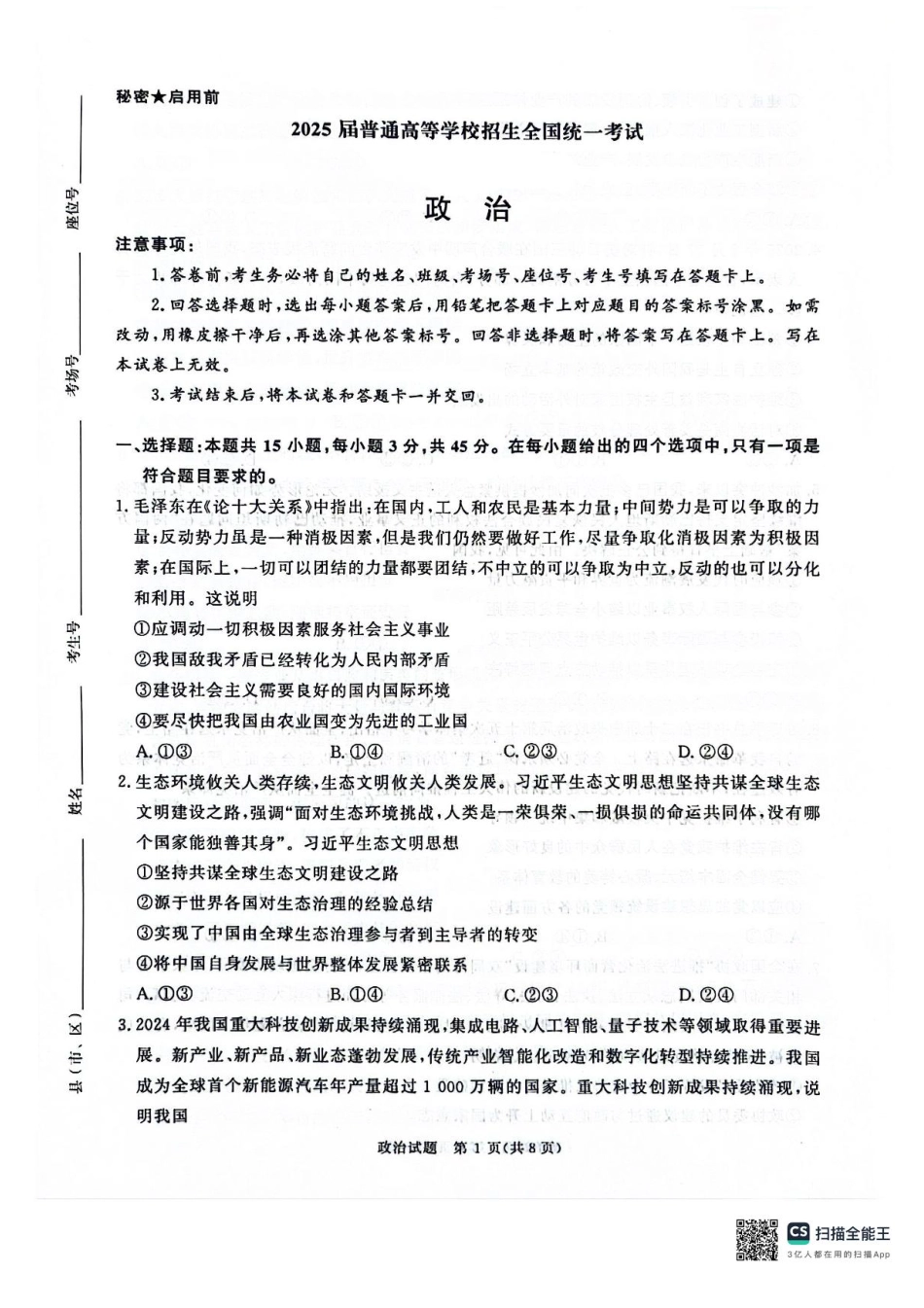 河南省2025届高三青桐鸣3月大联考政治试题+答案.pdf_第1页