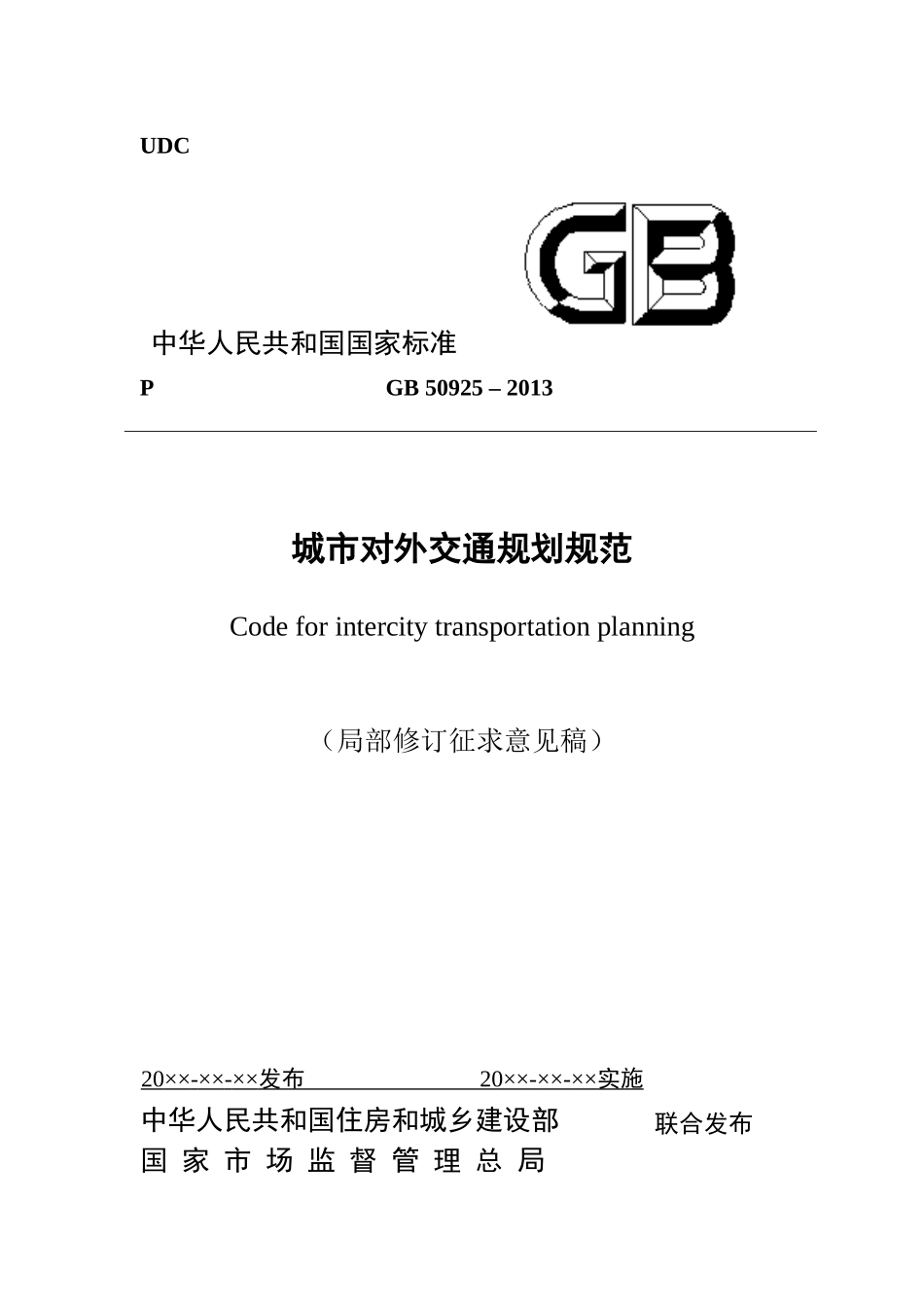 UDC中华人民共和国国家标准PGB50925–2013城市对外交通规划规范Codeforintercitytransportationplanning(局部修订征求意见稿)20××-××-××发布20××-××-××实施中华人民共和国住房和城乡建设部国家市场...