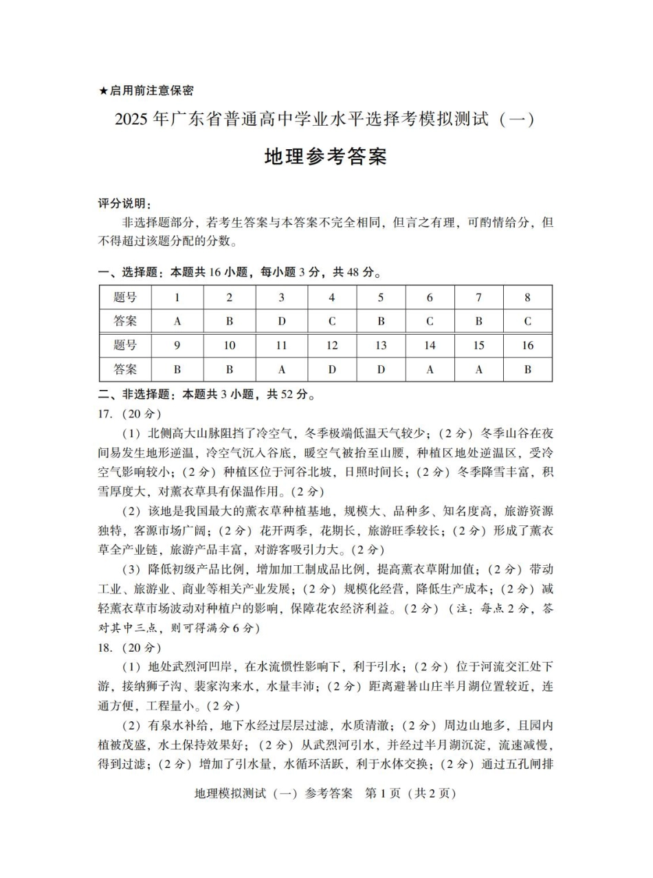 广东省2025年普通高等学校招生全国统一考试模拟测试(一)地理答案.pdf_第2页