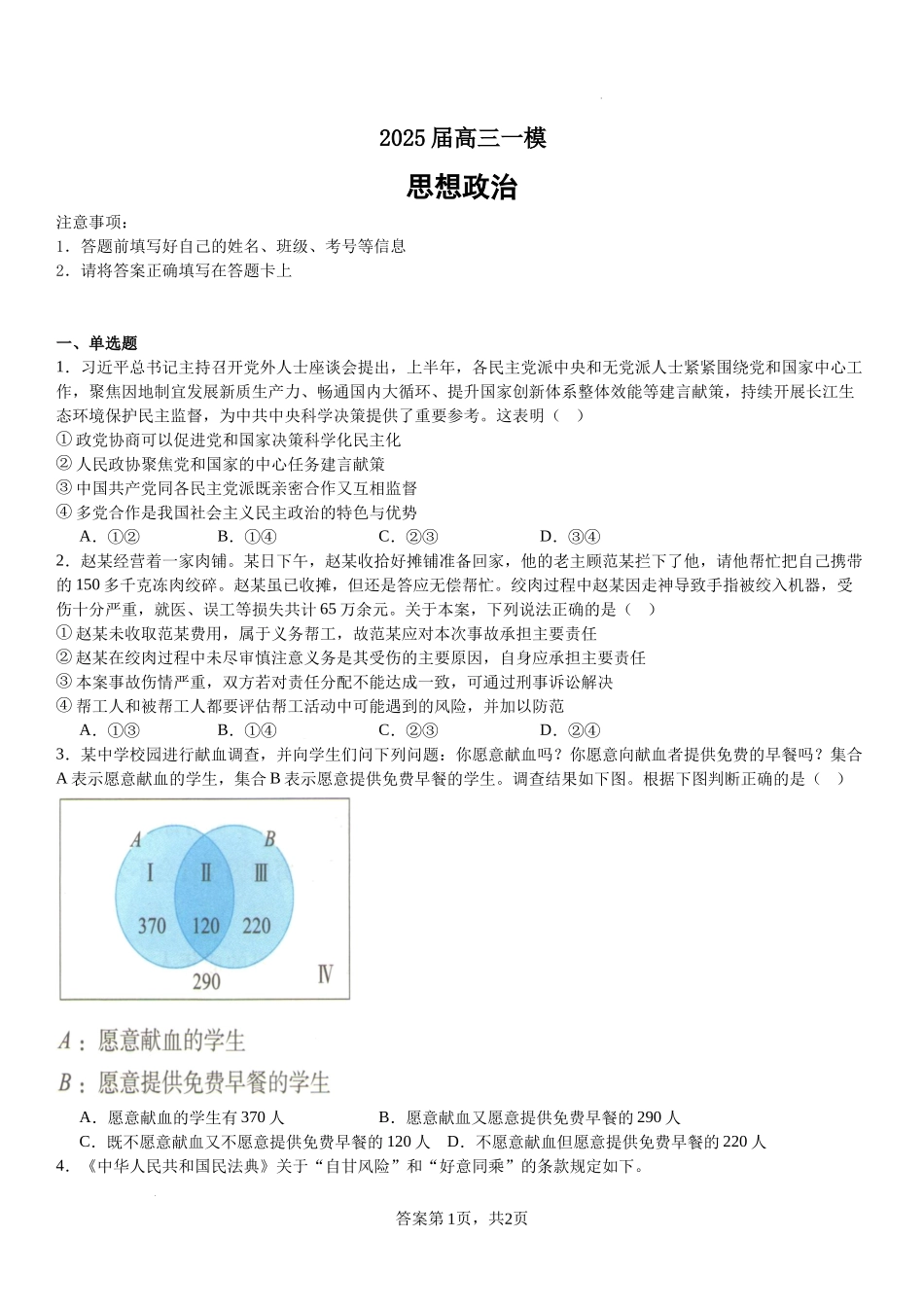 2025届高三一模思想政治注意事项:1.答题前填写好自己的姓名、班级、考号等信息2.请将答案正确填写在答题卡上一、单选题1.习近平总书记主持召开党外人士座谈会提出,上半年,各民主党派中央和无党派人士紧紧围...