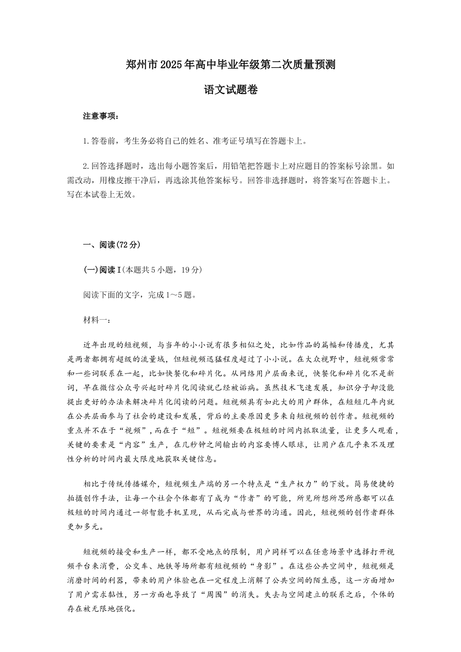 郑州市2025年高中毕业年级第二次质量预测语文试题卷注意事项:1.答卷前,考生务必将自己的姓名、准考证号填写在答题卡上。2.回答选择题时,选出每小题答案后,用铅笔把答题卡上对应题目的答案标号涂黑。如需改动...