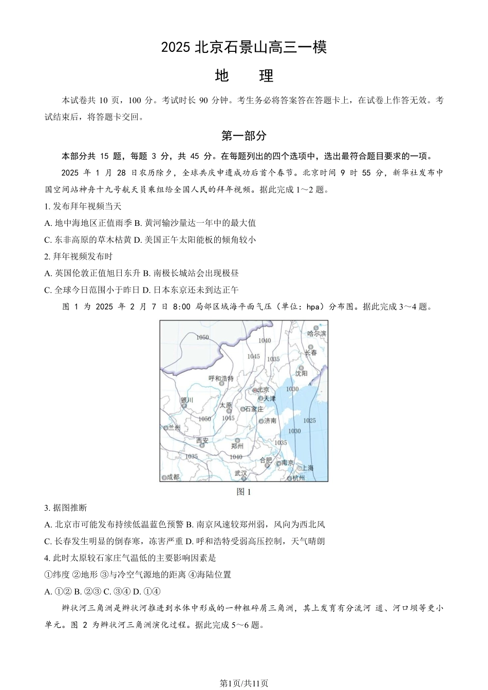 第1页/共11页2025北京石景山高三一模地理本试卷共10页,100分。考试时长90分钟。考生务必将答案答在答题卡上,在试卷上作答无效。考试结束后,将答题卡交回。第一部分本部分共15题,每题3分,共45分。在每题列出...