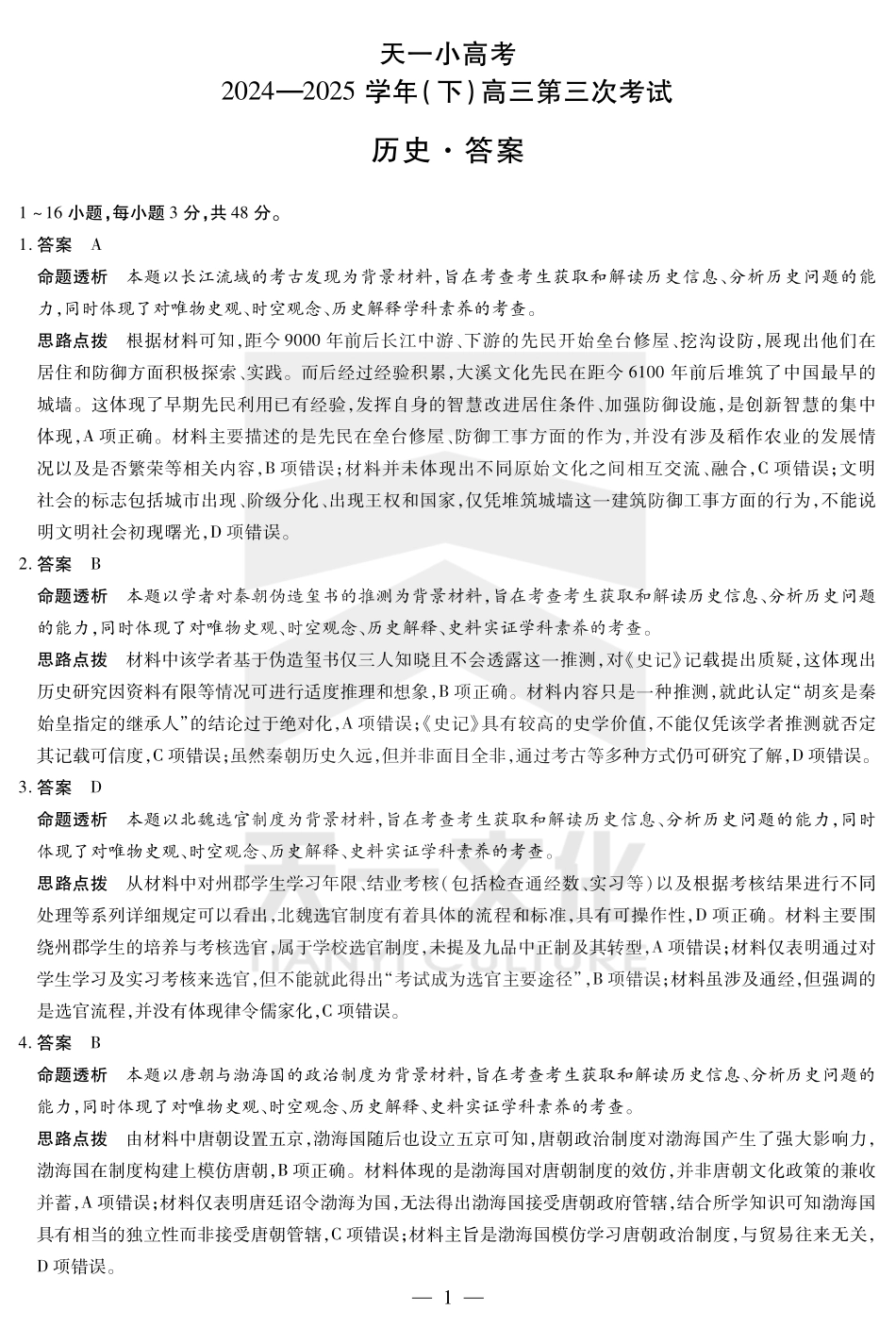 河南省天一小高考2024-2025学年(下)高三第三次考试历史答案.pdf_第1页