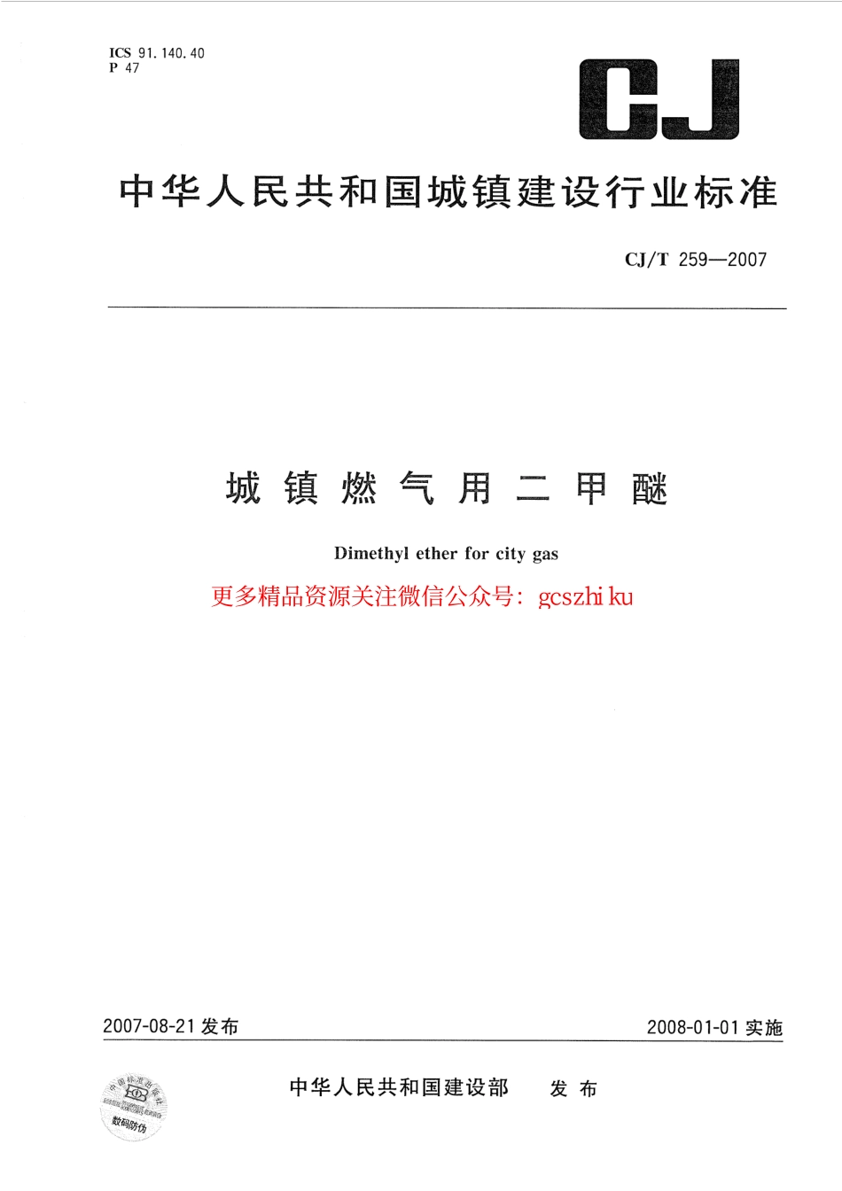 标准规范下载.CJT259-2007 城镇燃气用二甲醚.pdf_第1页