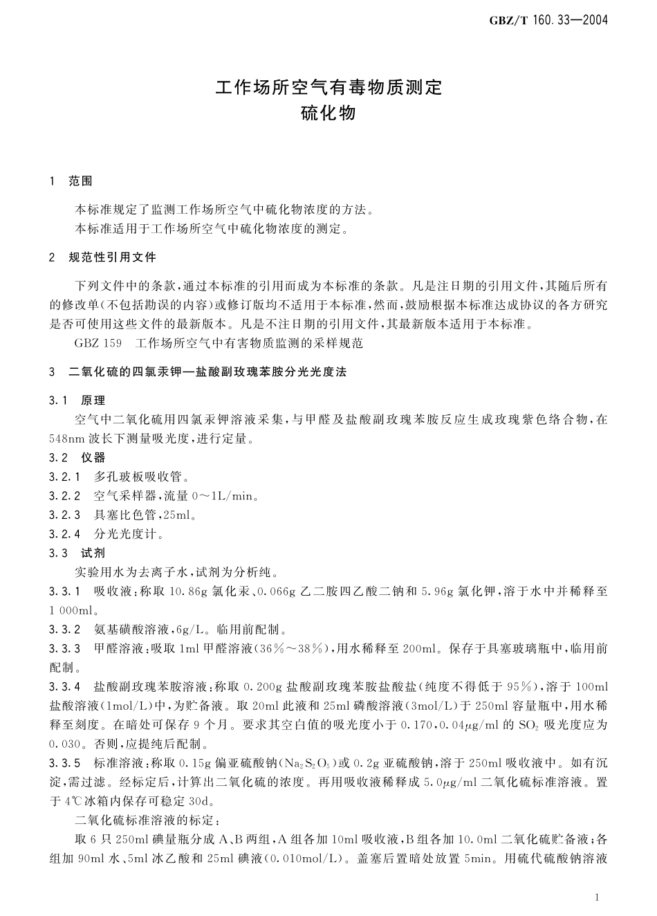 GBZT160.33-2004工作场所空气有毒物质测定 硫化物.pdf_第1页