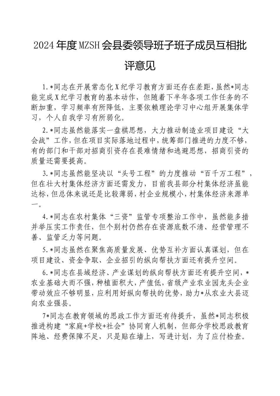2024年度民主生活会县委领导班子班子成员互相批评意见.doc