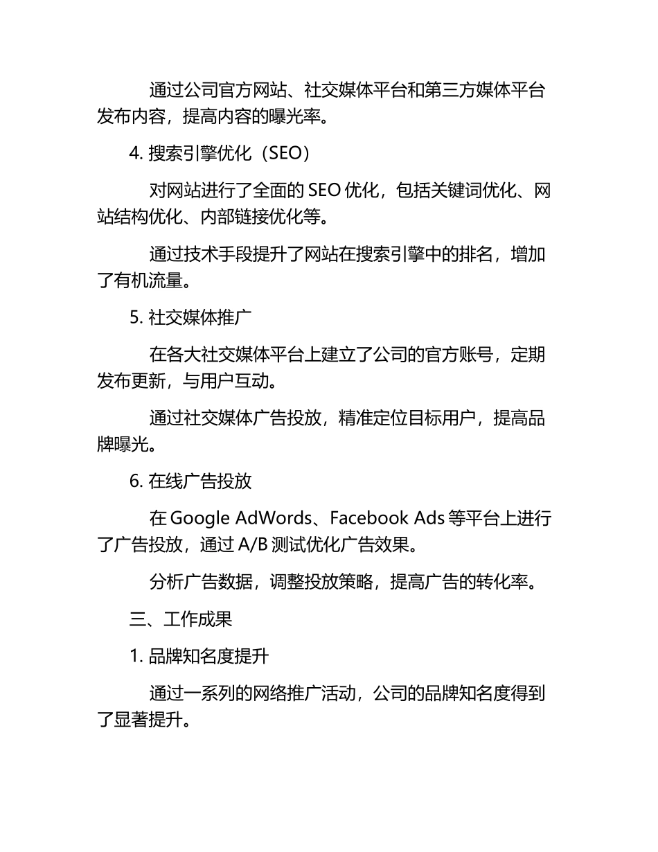 网络推广工作总结范文一、前言随着互联网的快速发展,网络推广已成为企业品牌建设和产品营销的重要手段。在过去的一年中,我担任公司网络推广专员,负责公司产品的线上推广工作。以下是我对过去一年网络推广工作...