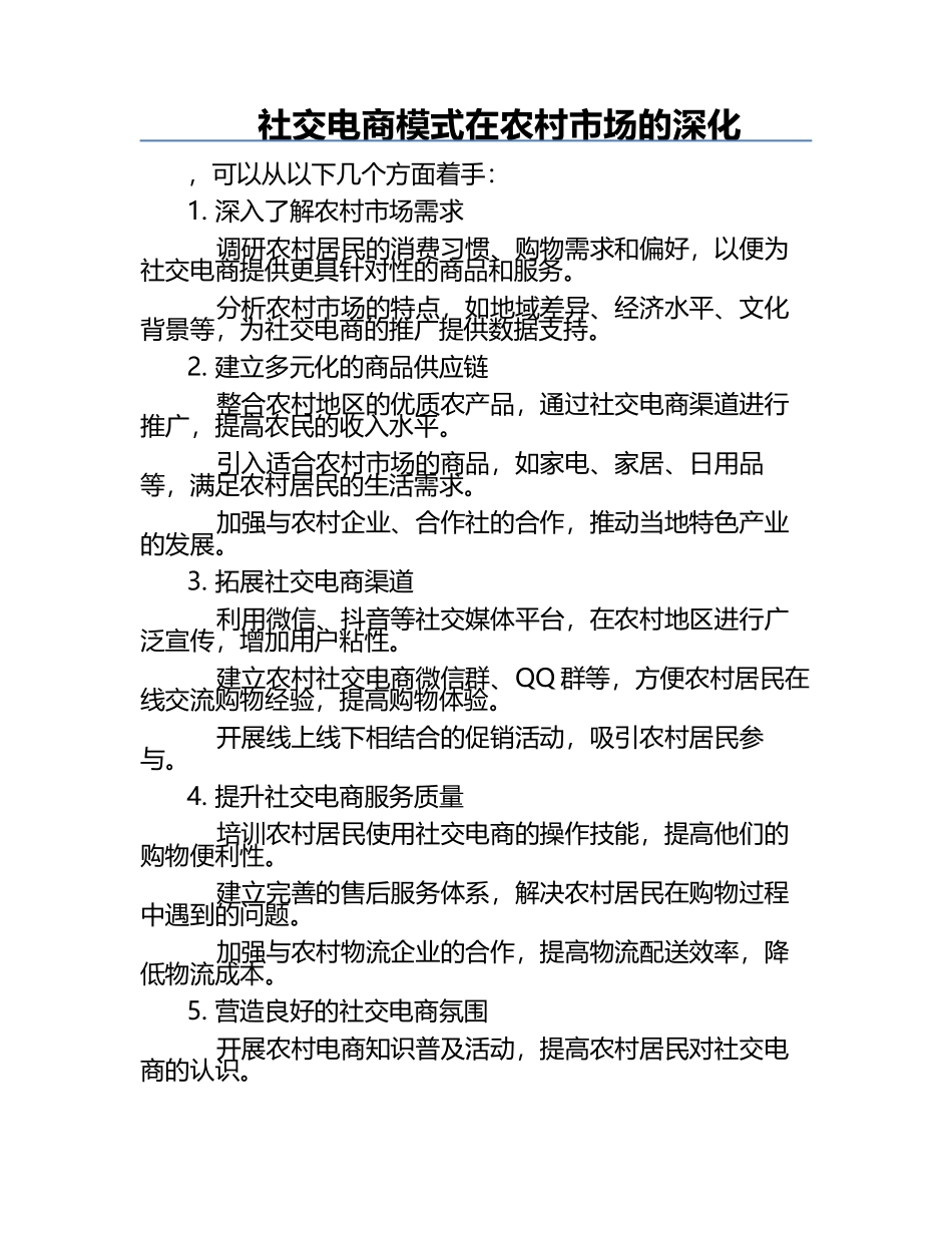 社交电商模式在农村市场的深化,可以从以下几个方面着手:1.深入了解农村市场需求调研农村居民的消费习惯、购物需求和偏好,以便为社交电商提供更具针对性的商品和服务。分析农村市场的特点,如地域差异、经济水...