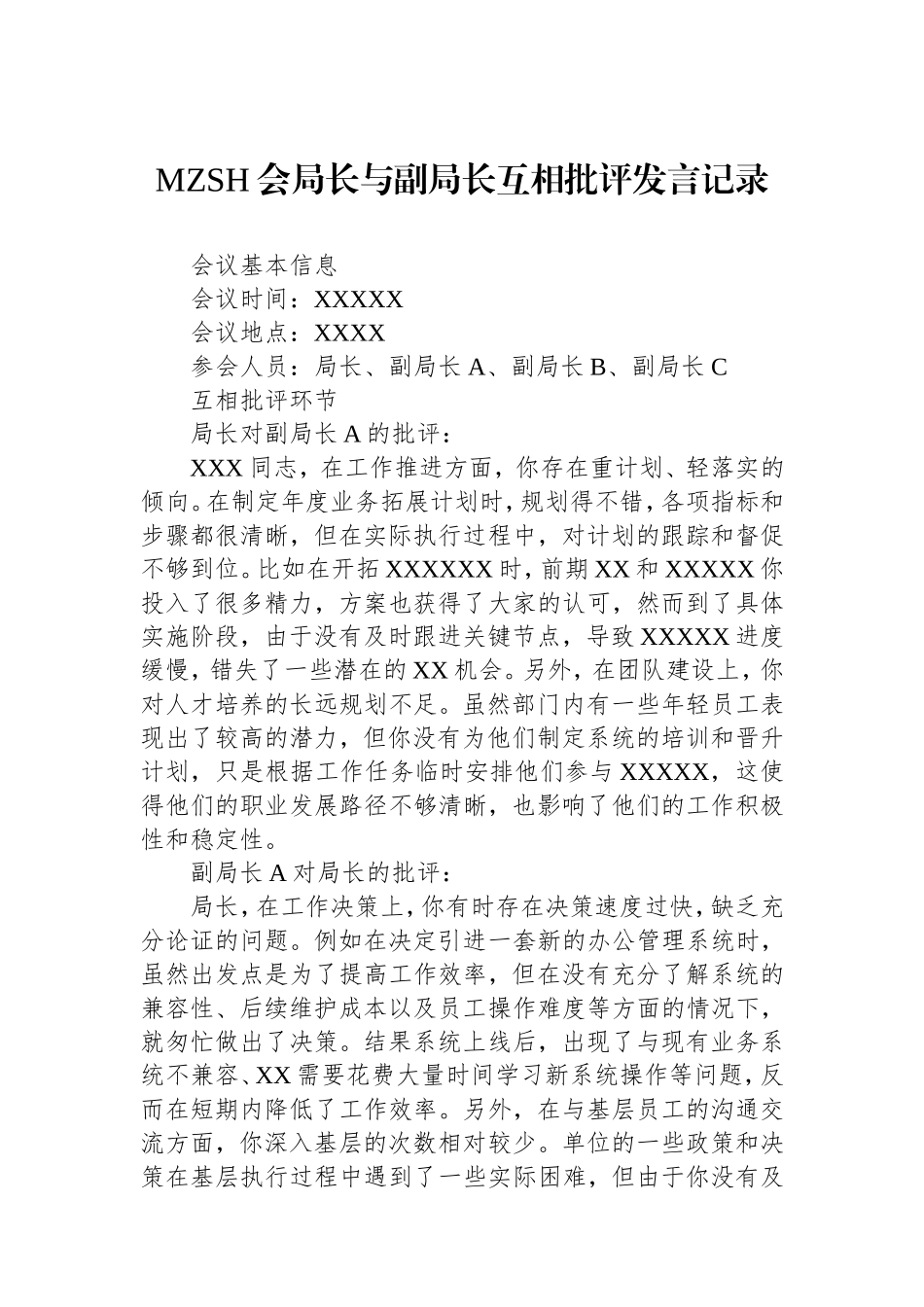 MZSH会局长与副局长互相批评发言记录会议基本信息会议时间:XXXXX会议地点:XXXX参会人员:局长、副局长A、副局长B、副局长C互相批评环节局长对副局长A的批评:XXX同志,在工作推进方面,你存在重计划、轻落实的...