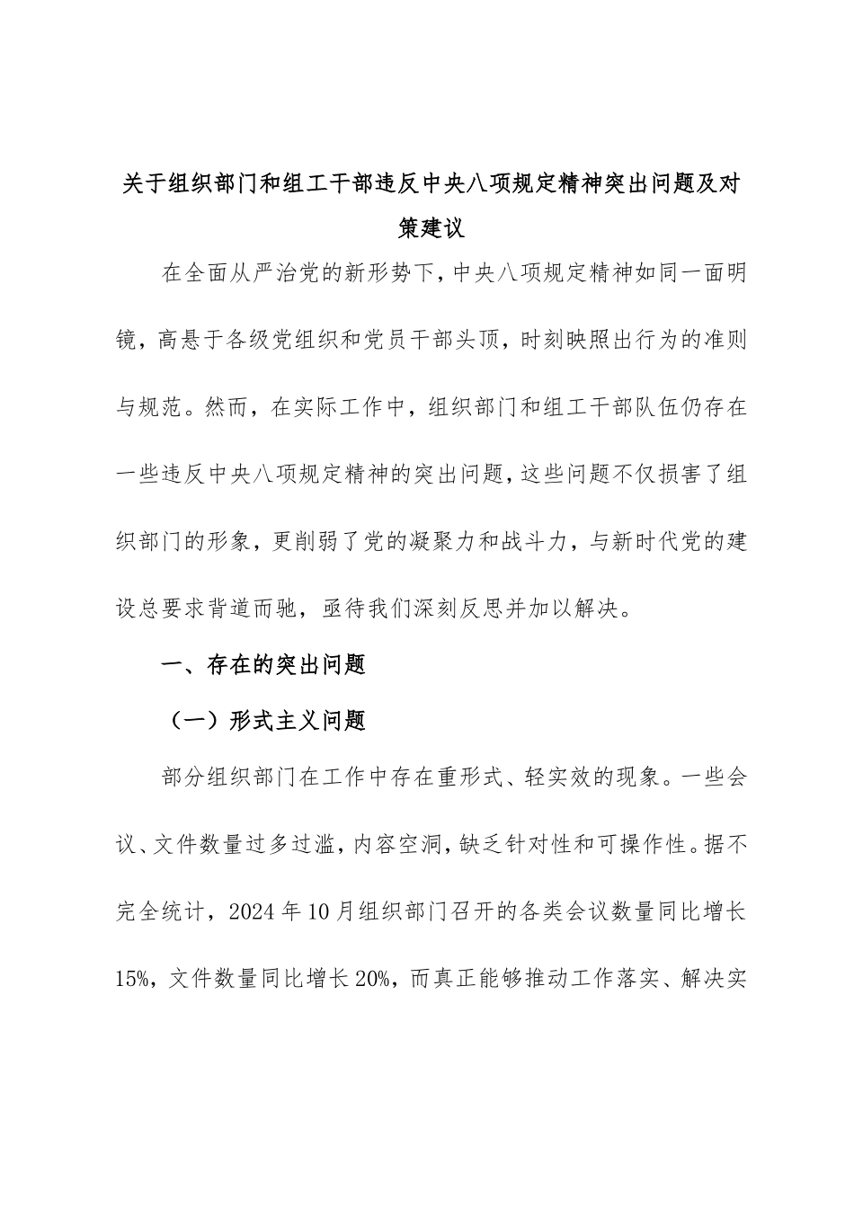 关于组织部门和组工干部违反中央八项规定精神突出问题及对策建议在全面从严治党的新形势下,中央八项规定精神如同一面明镜,高悬于各级党组织和党员干部头顶,时刻映照出行为的准则与规范。然而,在实际工作中,...