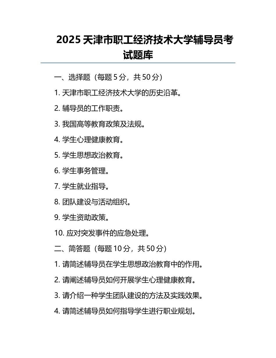 2025天津市职工经济技术大学辅导员考试题库一、选择题(每题5分,共50分)1.天津市职工经济技术大学的历史沿革。2.辅导员的工作职责。3.我国高等教育政策及法规。4.学生心理健康教育。5.学生思想政治教育。6.学生...