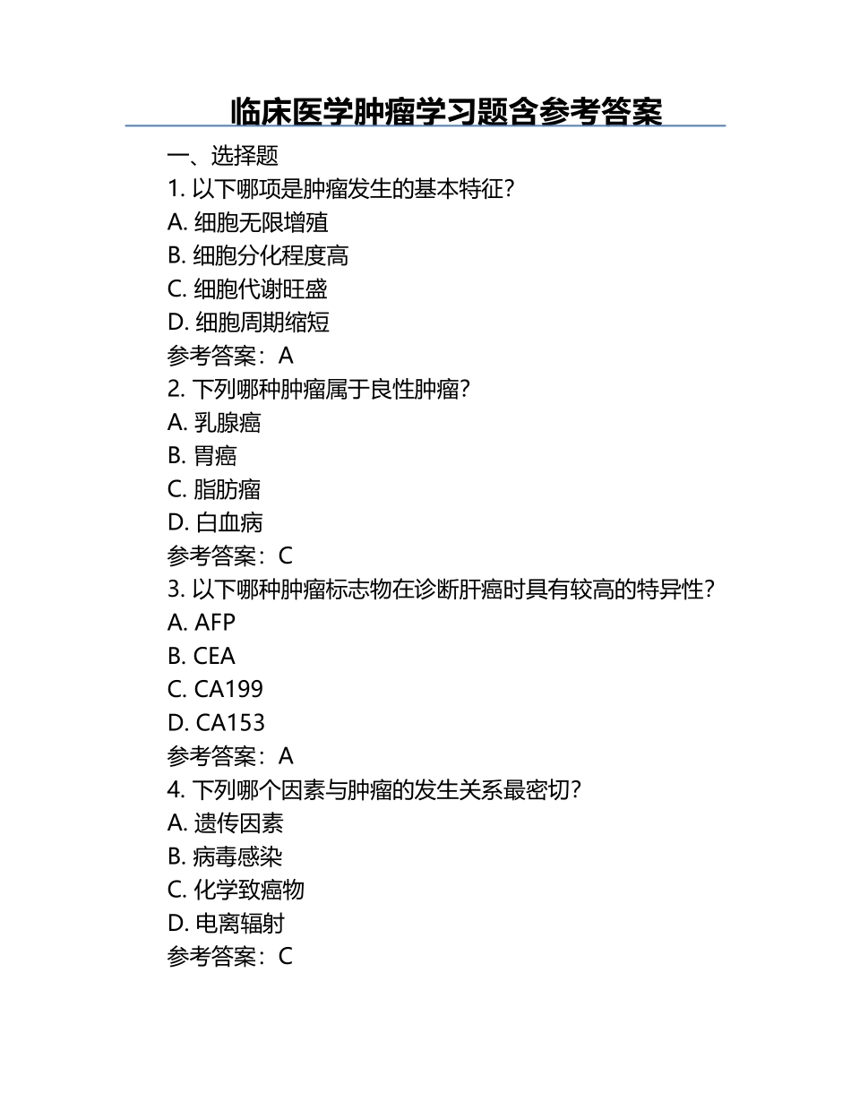 临床医学肿瘤学习题含参考答案一、选择题1.以下哪项是肿瘤发生的基本特征?A.细胞无限增殖B.细胞分化程度高C.细胞代谢旺盛D.细胞周期缩短参考答案:A2.下列哪种肿瘤属于良性肿瘤?A.乳腺癌B.胃癌C.脂肪瘤D.白血病...