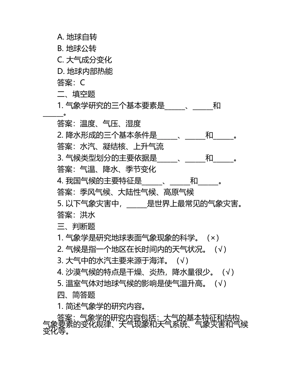 气象学与气候学试题及答案OK一、选择题1.气象学是研究地球大气层的哪一部分?A.对流层B.平流层C.整个大气层D.对流层和平流层答案:C2.以下哪个气象要素是描述空气温度的?A.气压B.湿度C.温度D.风速答案:C3.地球...