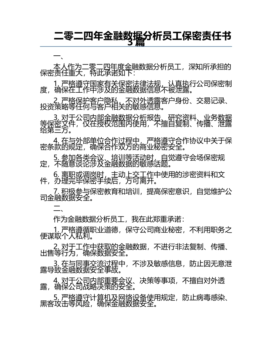 二零二四年金融数据分析员工保密责任书3篇.docx