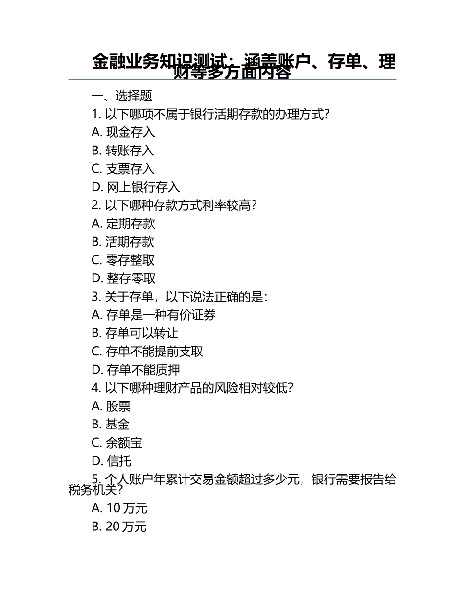 金融业务知识测试:涵盖账户、存单、理财等多方面内容一、选择题1.以下哪项不属于银行活期存款的办理方式?A.现金存入B.转账存入C.支票存入D.网上银行存入2.以下哪种存款方式利率较高?A.定期存款B.活期存款C.零...
