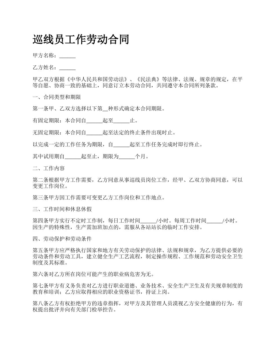 巡线员工作劳动合同甲方名称:______乙方姓名:______甲乙双方根据《中华人民共和国劳动法》、《民法典》等法律、法规、规章的规定,在平等自愿、协商一致的基础上,同意订立本劳动合同,共同遵守本合同所列条款...