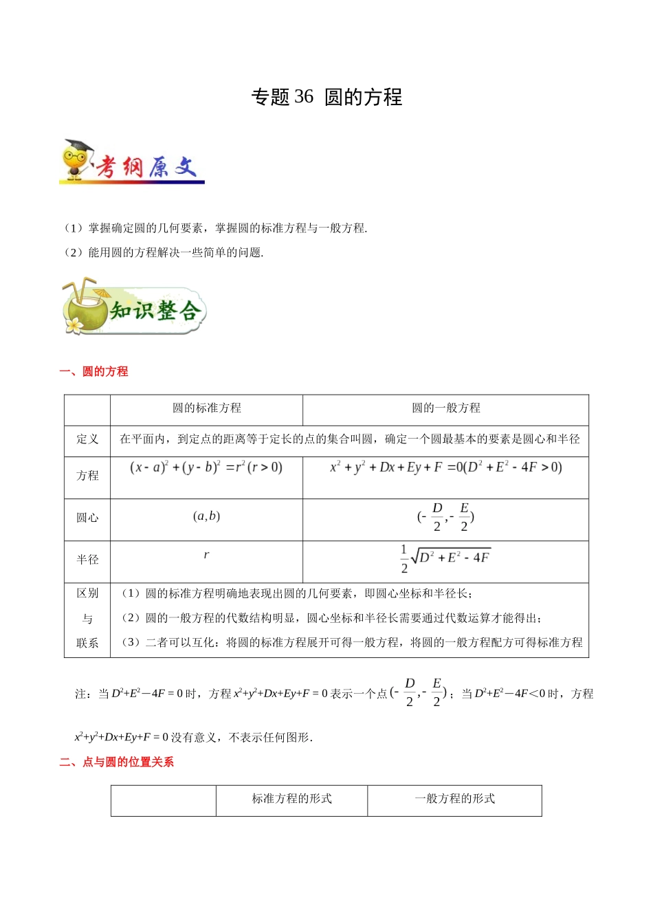 专题36圆的方程(1)掌握确定圆的几何要素,掌握圆的标准方程与一般方程.(2)能用圆的方程解决一些简单的问题.一、圆的方程圆的标准方程圆的一般方程定义在平面内,到定点的距离等于定长的点的集合叫圆,确定一...