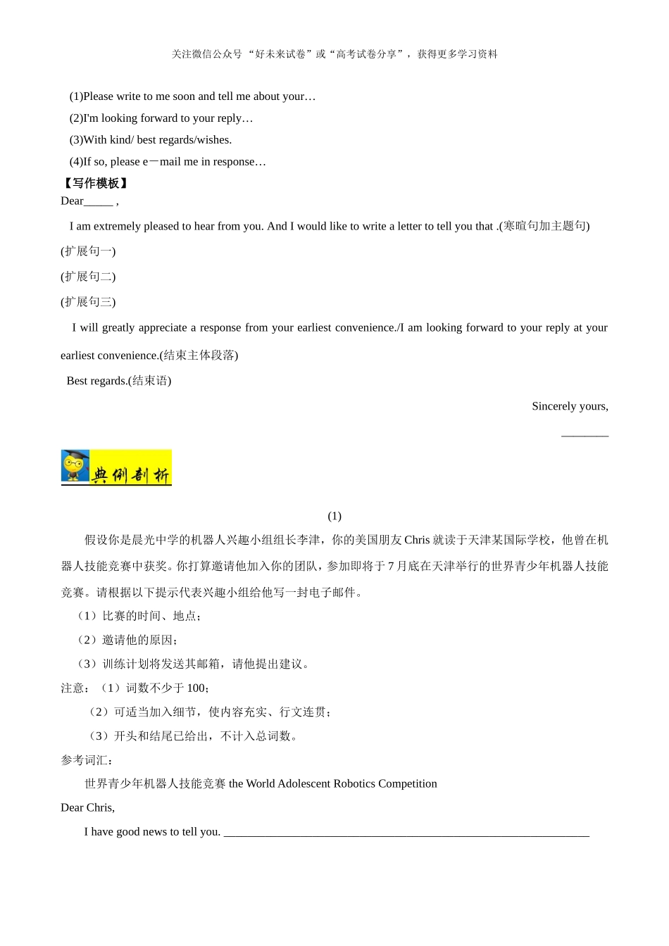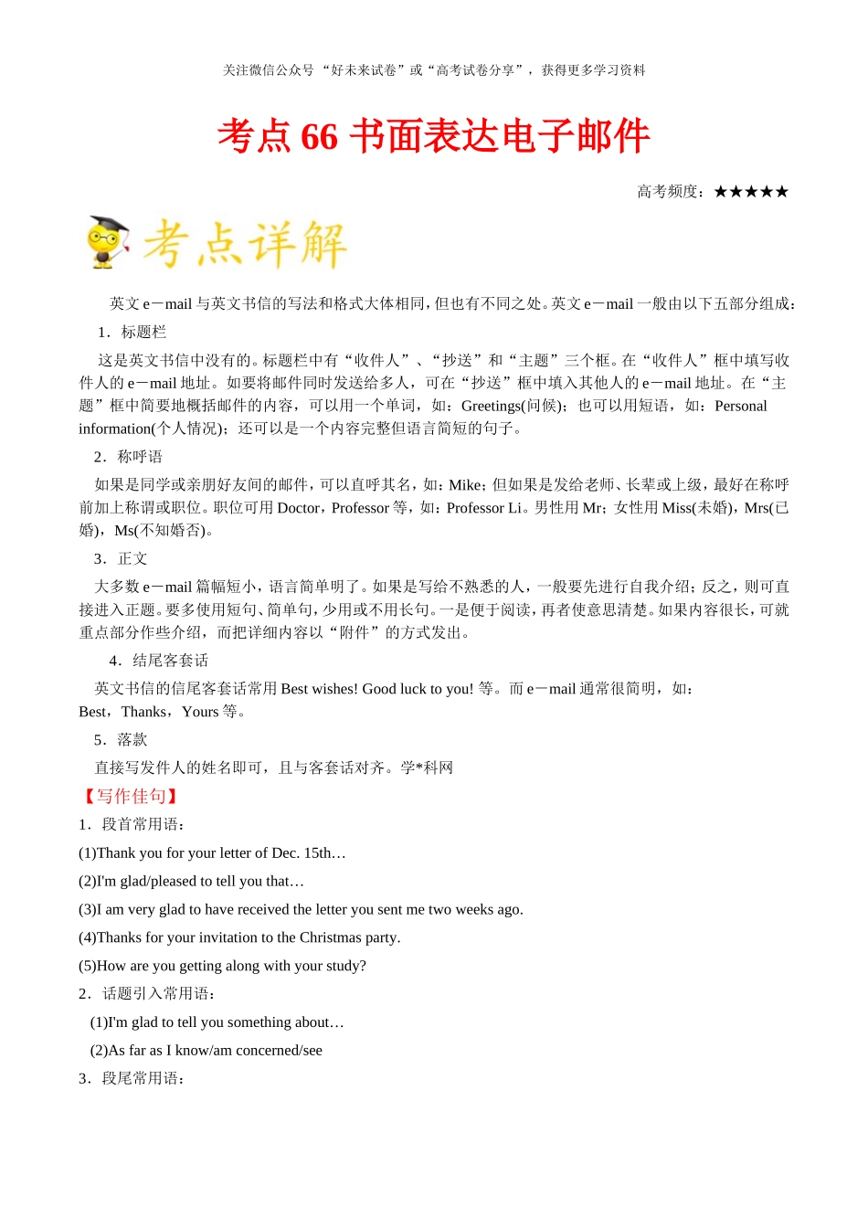 关注微信公众号“好未来试卷”或“高考试卷分享”,获得更多学习资料考点66书面表达电子邮件高考频度:★★★★★英文e-mail与英文书信的写法和格式大体相同,但也有不同之处。英文e-mail一般由以下五部分组成...