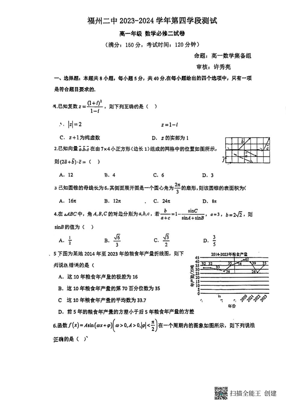 福州二中2024年高一下学期期末考试数学试卷.pdf_第1页