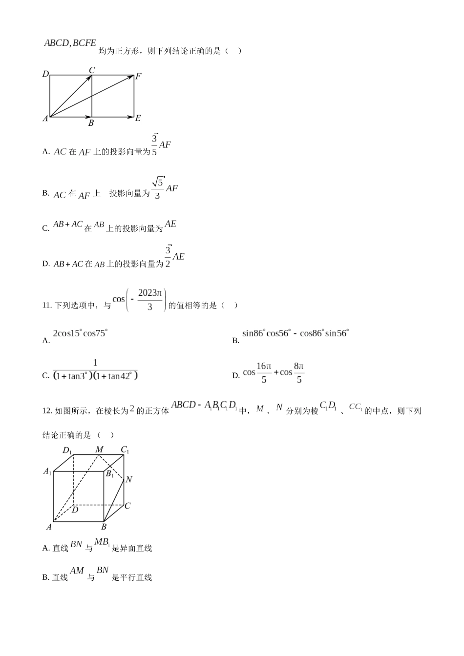 酒泉市普通高中2022~2023学年度第二学期期末考试高一数学一、选择题:本题共8小题,每小题5分,共40分.在每小题给出的四个选项中,只有一个选项是符合题目要求的.1.已知复数满足,则A.B.C.D.2.对于非零向量,下...