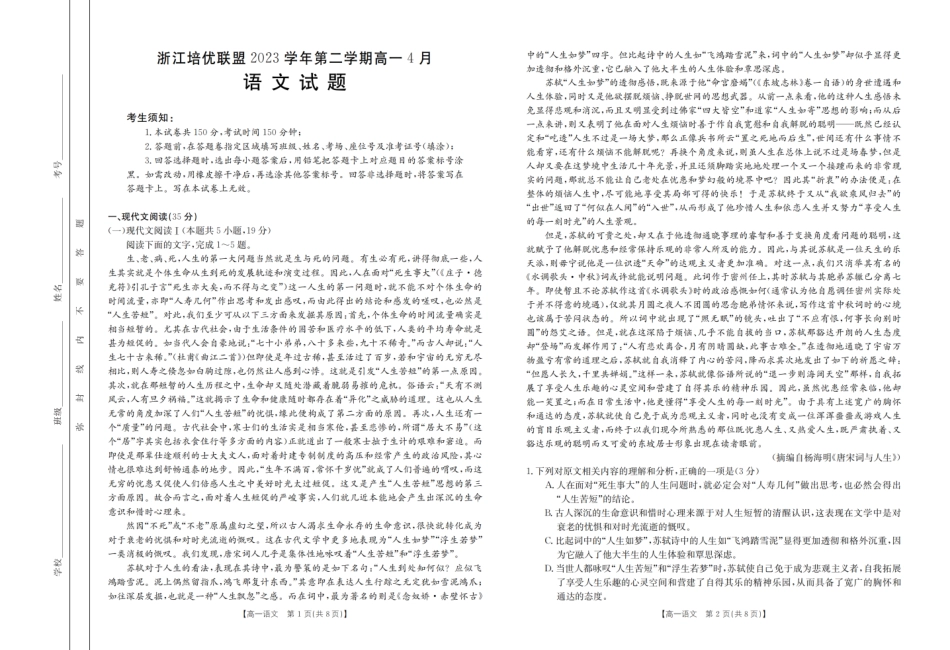 培优联盟2023-2024学年高一下学期4月联考语文卷.pdf_第1页