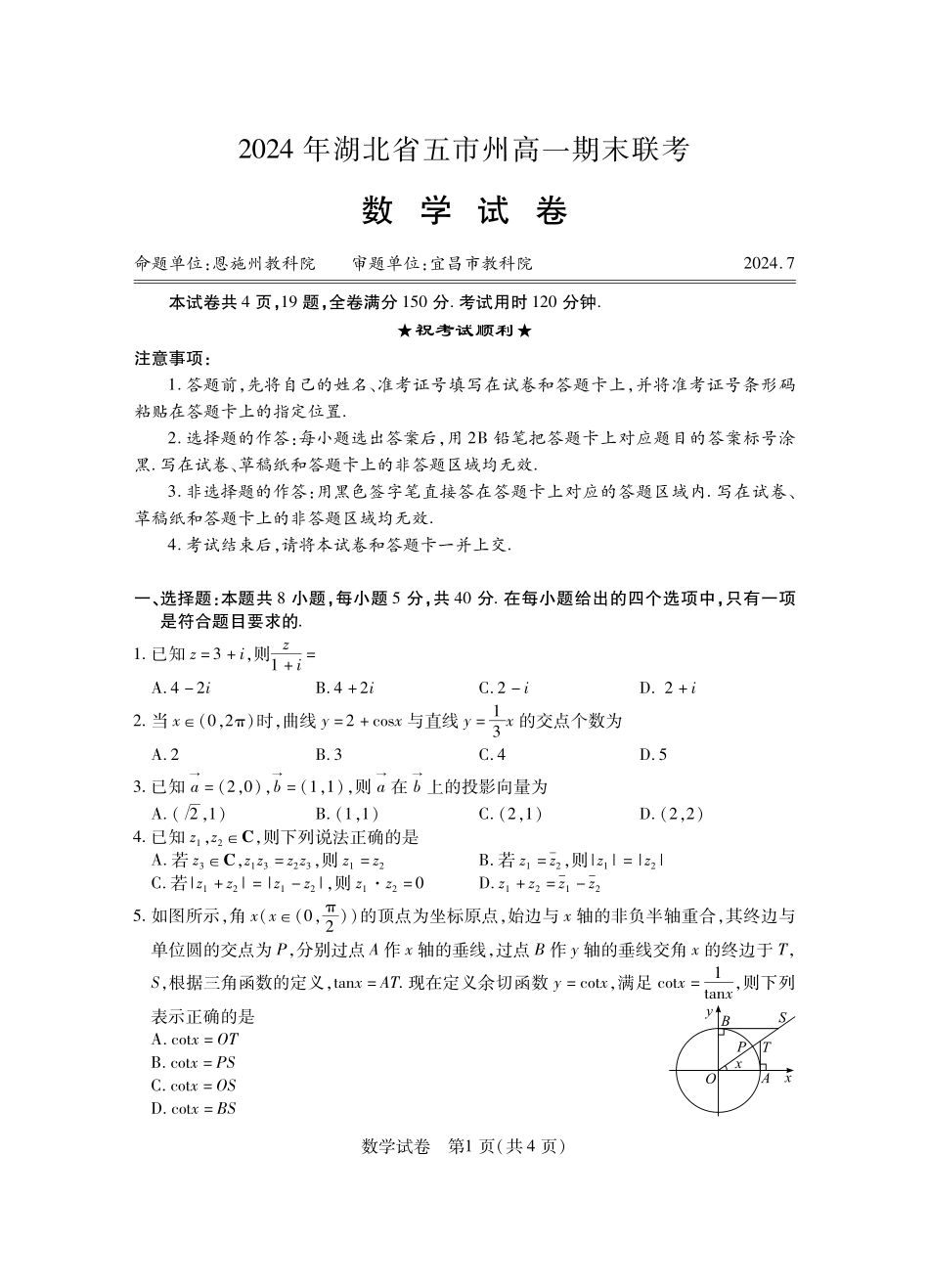 湖北省五市州2023-2024学年高一下学期7月期末联考考试数学试卷.pdf_第1页