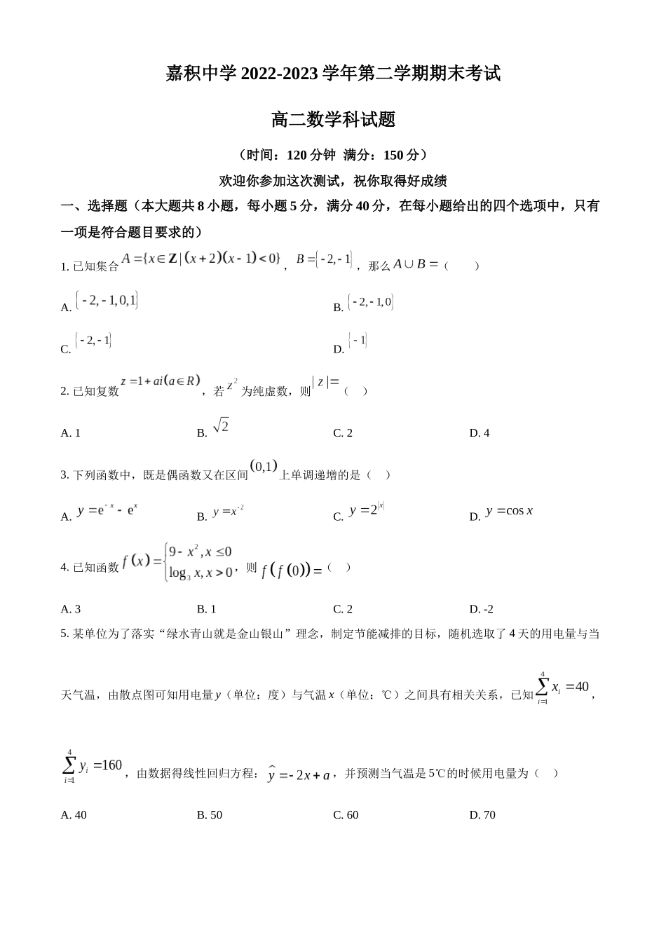 嘉积中学2022-2023学年第二学期期末考试高二数学科试题(时间:120分钟满分:150分)欢迎你参加这次测试,祝你取得好成绩一、选择题(本大题共8小题,每小题5分,满分40分,在每小题给出的四个选项中,只有一项是...