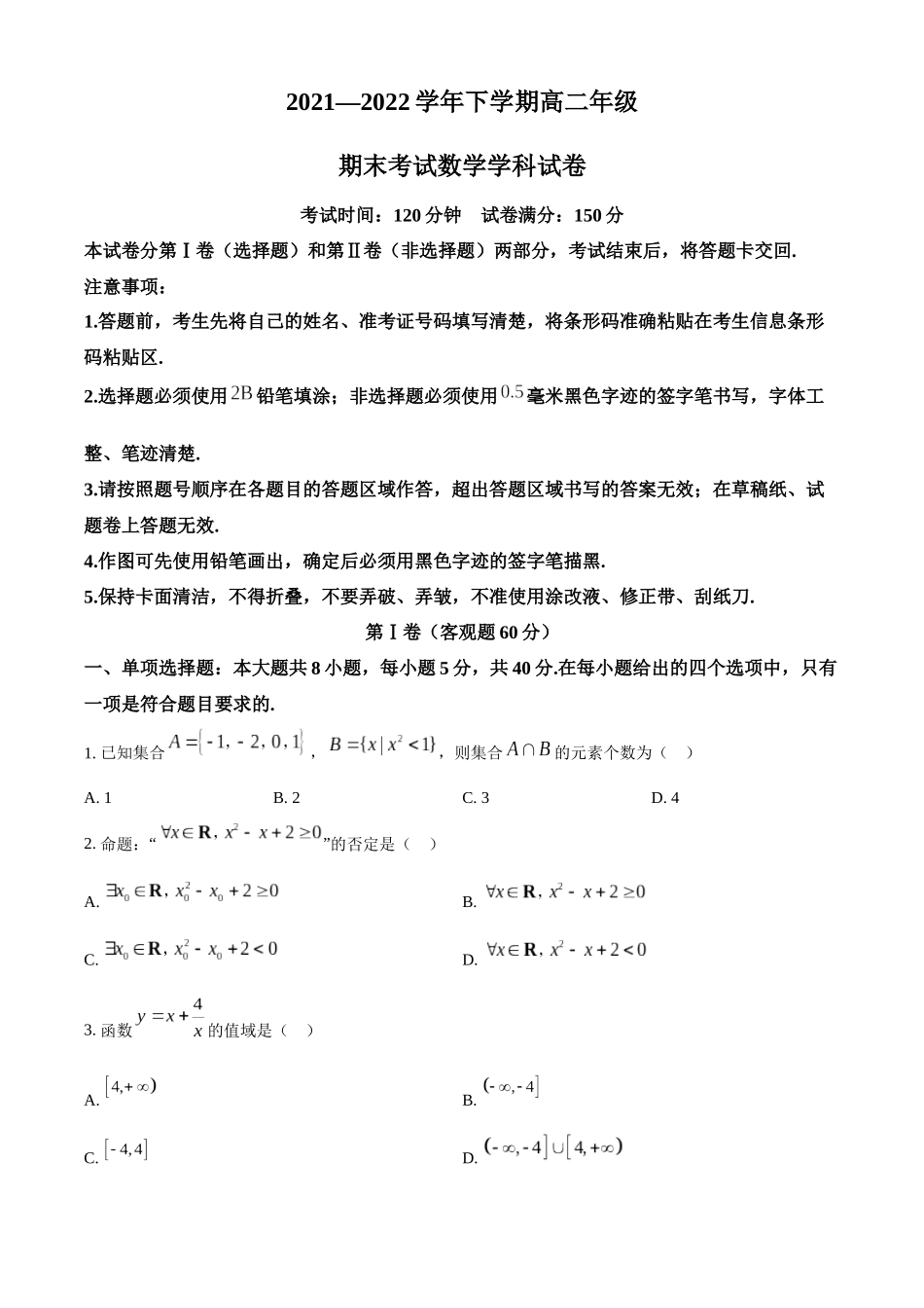 2021—2022学年下学期高二年级期末考试数学学科试卷考试时间:120分钟试卷满分:150分本试卷分第Ⅰ卷(选择题)和第Ⅱ卷(非选择题)两部分,考试结束后,将答题卡交回.注意事项:1.答题前,考生先将自己的姓名、...