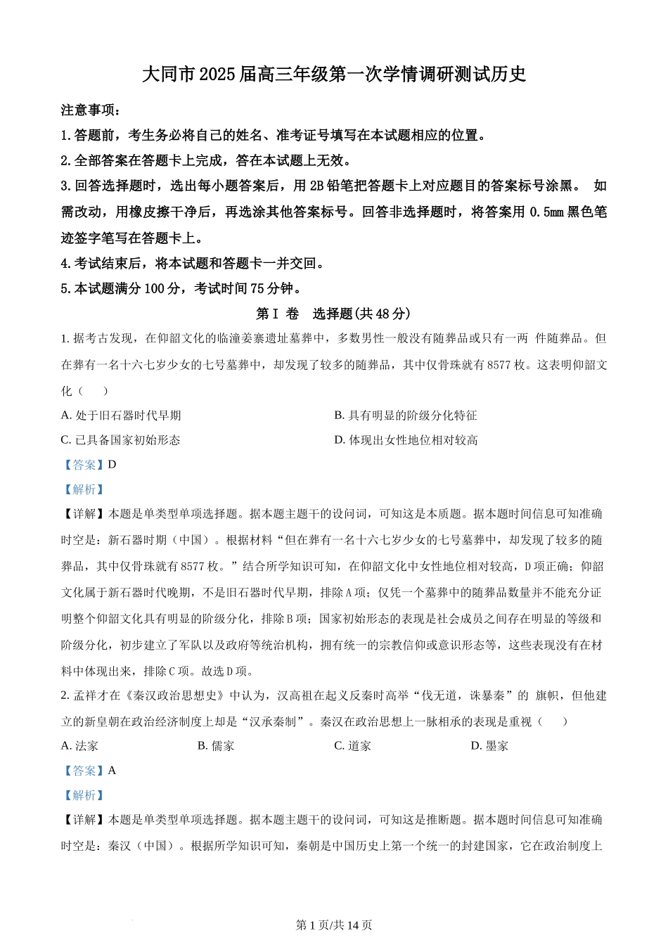 大同市2025届高三年级第一次学情调研测试历史注意事项:1.答题前,考生务必将自己的姓名、准考证号填写在本试题相应的位置。2.全部答案在答题卡上完成,答在本试题上无效。3.回答选择题时,选出每小题答案后,用2...