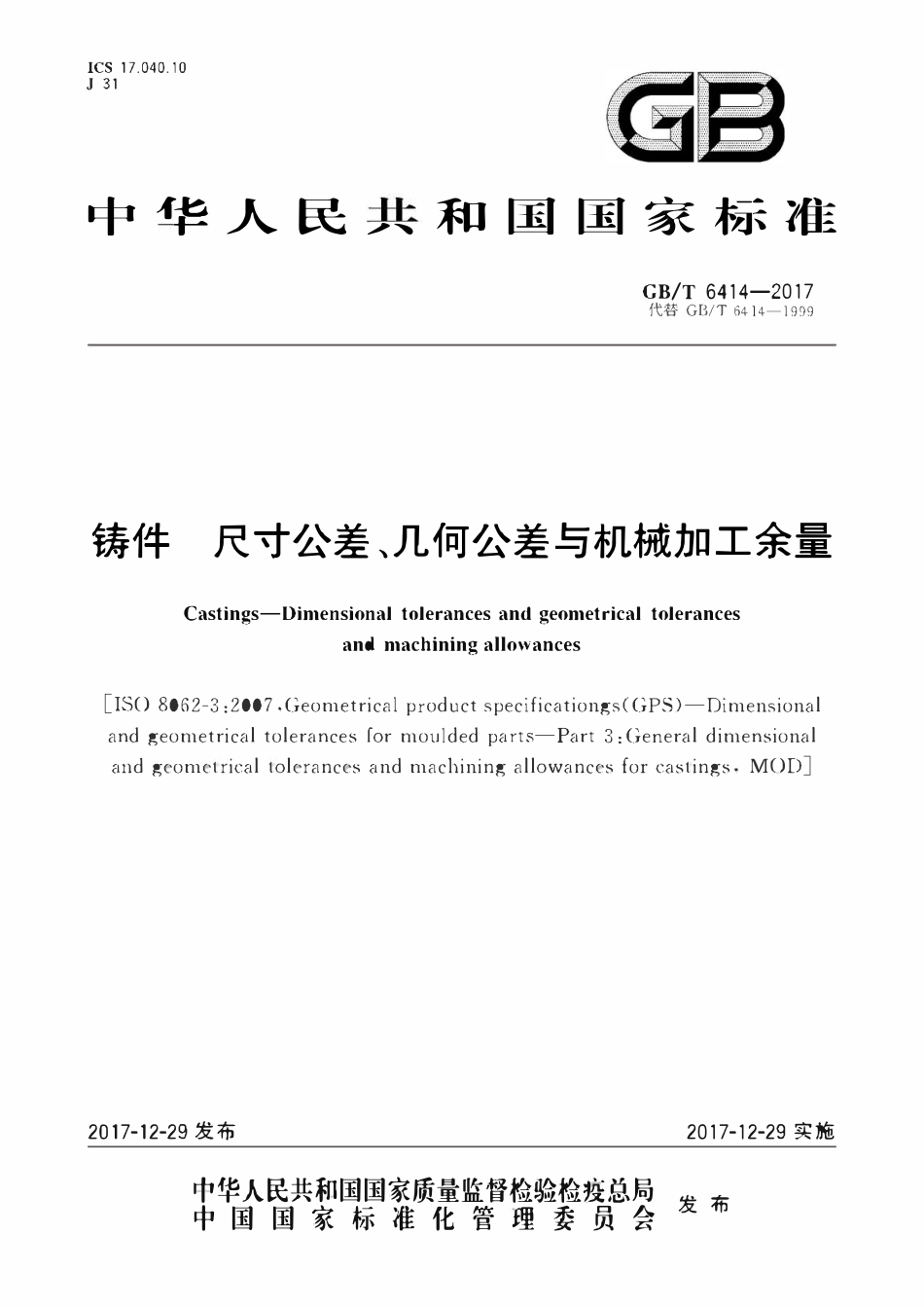 ICS17.040.10J31中f匕十人民/、和因国家析;市三GB/T6414一2017代替GB/T6414一1999铸件尺寸公差、几何公差与机械加工余量Castings—Dimensionaltolerancesandgeometricaltolerancesandmachiningallowances[ISO806...