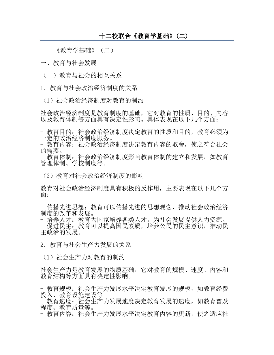 十二校联合《教育学基础》(二)《教育学基础》(二)一、教育与社会发展(一)教育与社会的相互关系1.教育与社会政治经济制度的关系(1)社会政治经济制度对教育的制约社会政治经济制度是教育制度的基础,它对教育...