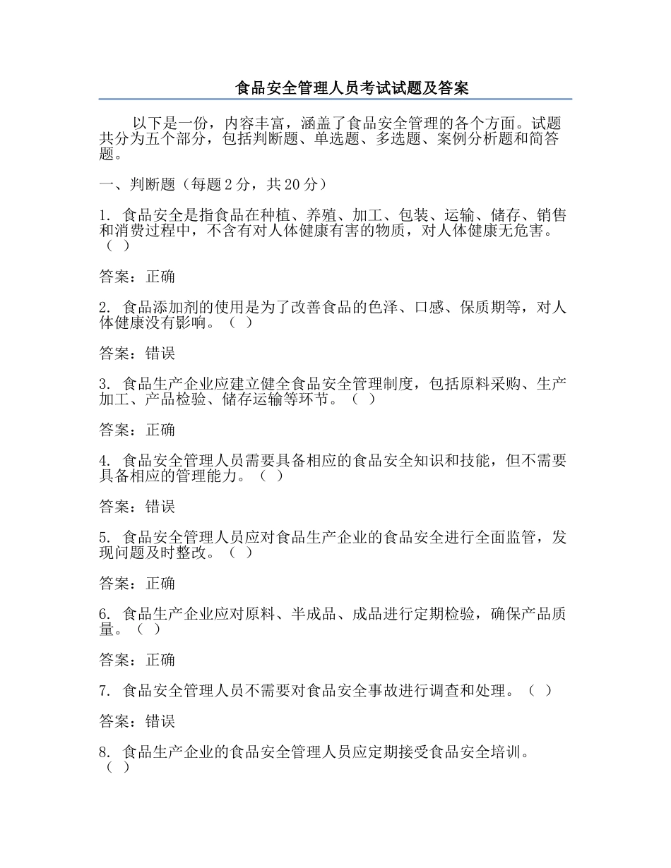 食品安全管理人员考试试题及答案以下是一份,内容丰富,涵盖了食品安全管理的各个方面。试题共分为五个部分,包括判断题、单选题、多选题、案例分析题和简答题。一、判断题(每题2分,共20分)1.食品安全是指食品...