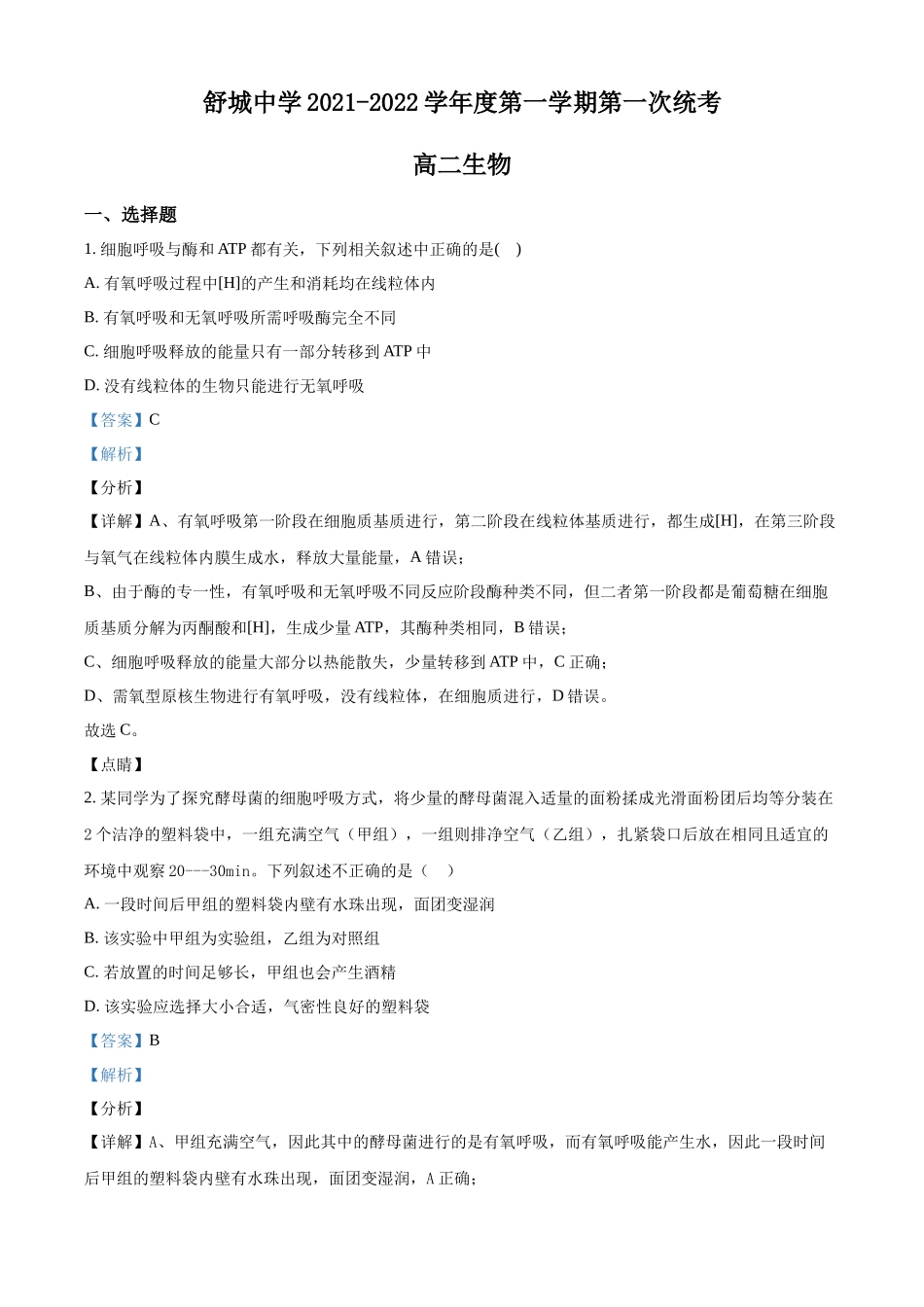 舒城中学2021-2022学年度第一学期第一次统考高二生物一、选择题1.细胞呼吸与酶和ATP都有关,下列相关叙述中正确的是()A.有氧呼吸过程中[H]的产生和消耗均在线粒体内B.有氧呼吸和无氧呼吸所需呼吸酶完全不同C.细胞...