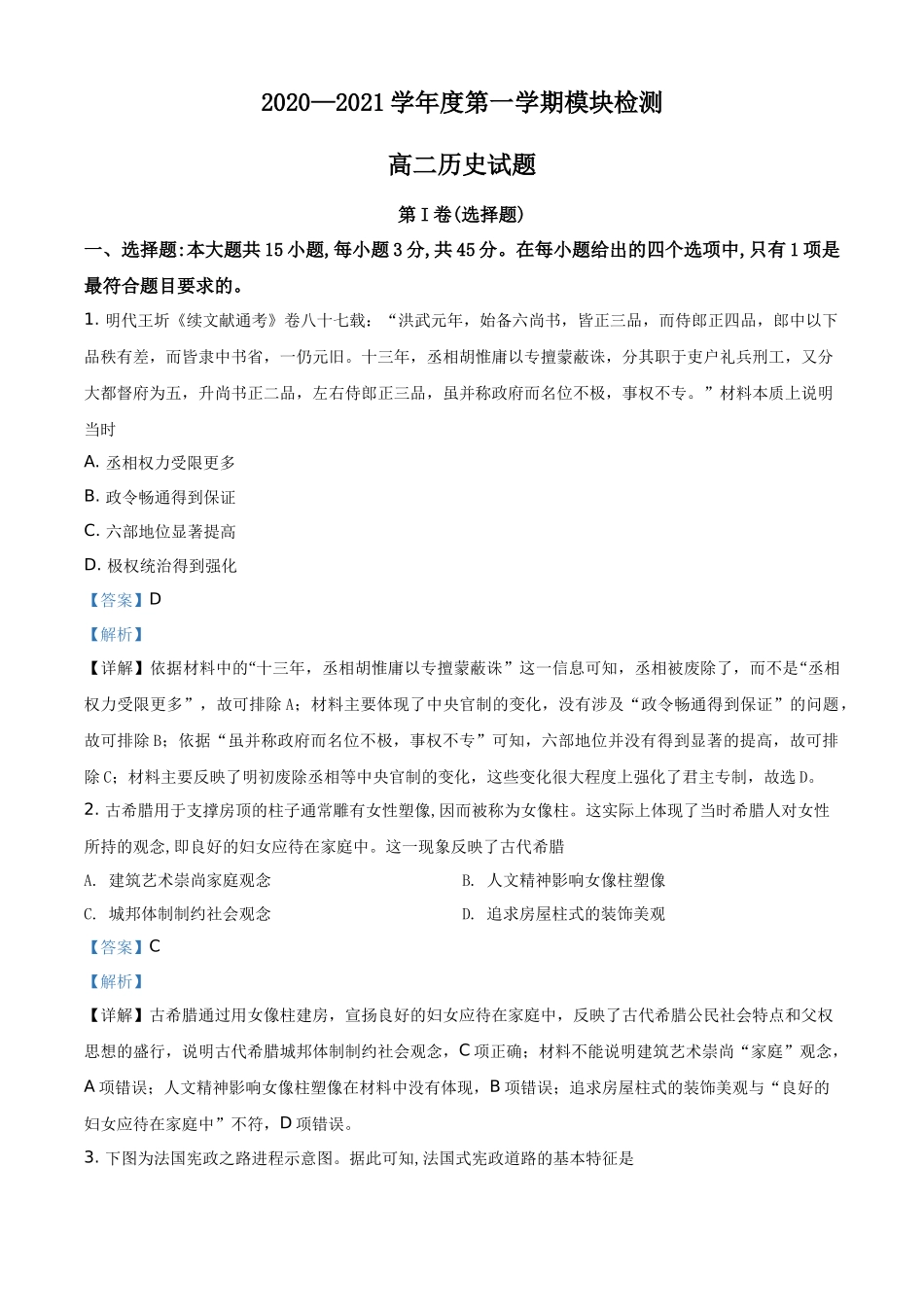 2020—2021学年度第一学期模块检测高二历史试题第I卷(选择题)一、选择题:本大题共15小题,每小题3分,共45分。在每小题给出的四个选项中,只有1项是最符合题目要求的。1.明代王圻《续文献通考》卷八十七载:“洪武元...