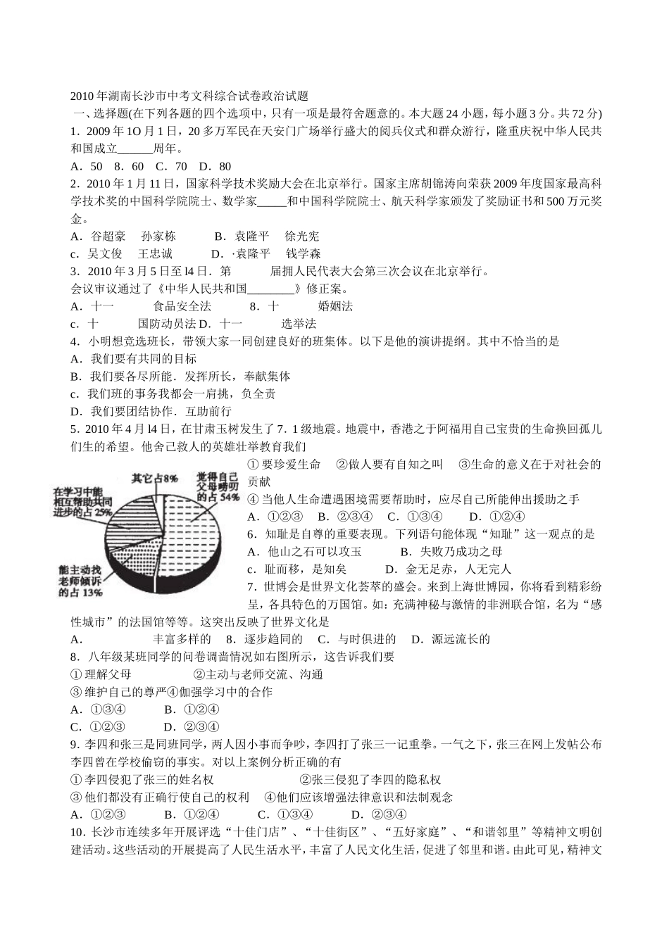 2010年湖南长沙市中考文科综合试卷政治试题一、选择题(在下列各题的四个选项中,只有一项是最符舍题意的。本大题24小题,每小题3分。共72分)1.2009年1O月1日,20多万军民在天安门广场举行盛大的阅兵仪式和群众游...