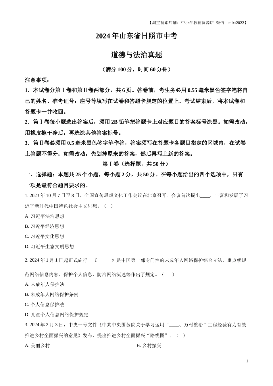 【淘宝搜索店铺:中小学教辅资源店微信:mlxt2022】2024年山东省日照市中考道德与法治真题(满分100分,时间60分钟)注意事项:1.本试卷分第Ⅰ卷和第Ⅱ卷两部分,共6页。答卷前,考生务必用0.55毫米黑色签字笔将...