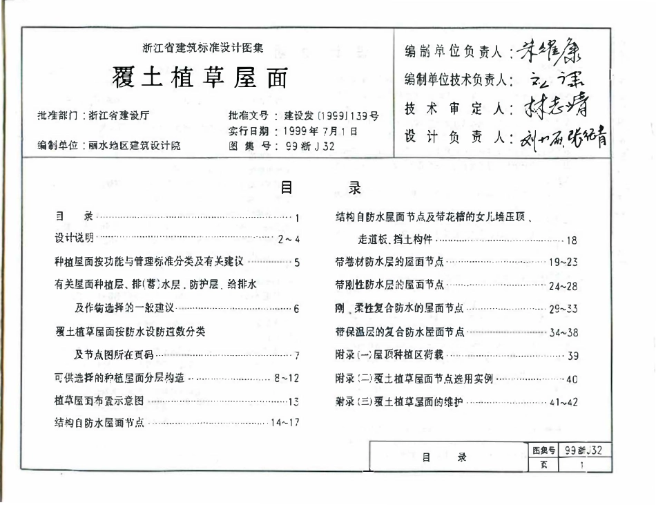 覆土植草屋面浙江省建筑标准设计建筑标准图栠图栠号:99浙J32浙江省标准设计站一九九九年六月浙江省建筑标准设计图集覆土植草屋面I·批准部门:浙江省建设厅编制单位:丽水地区莲筑设计院批准文号:建设发(1999]1...