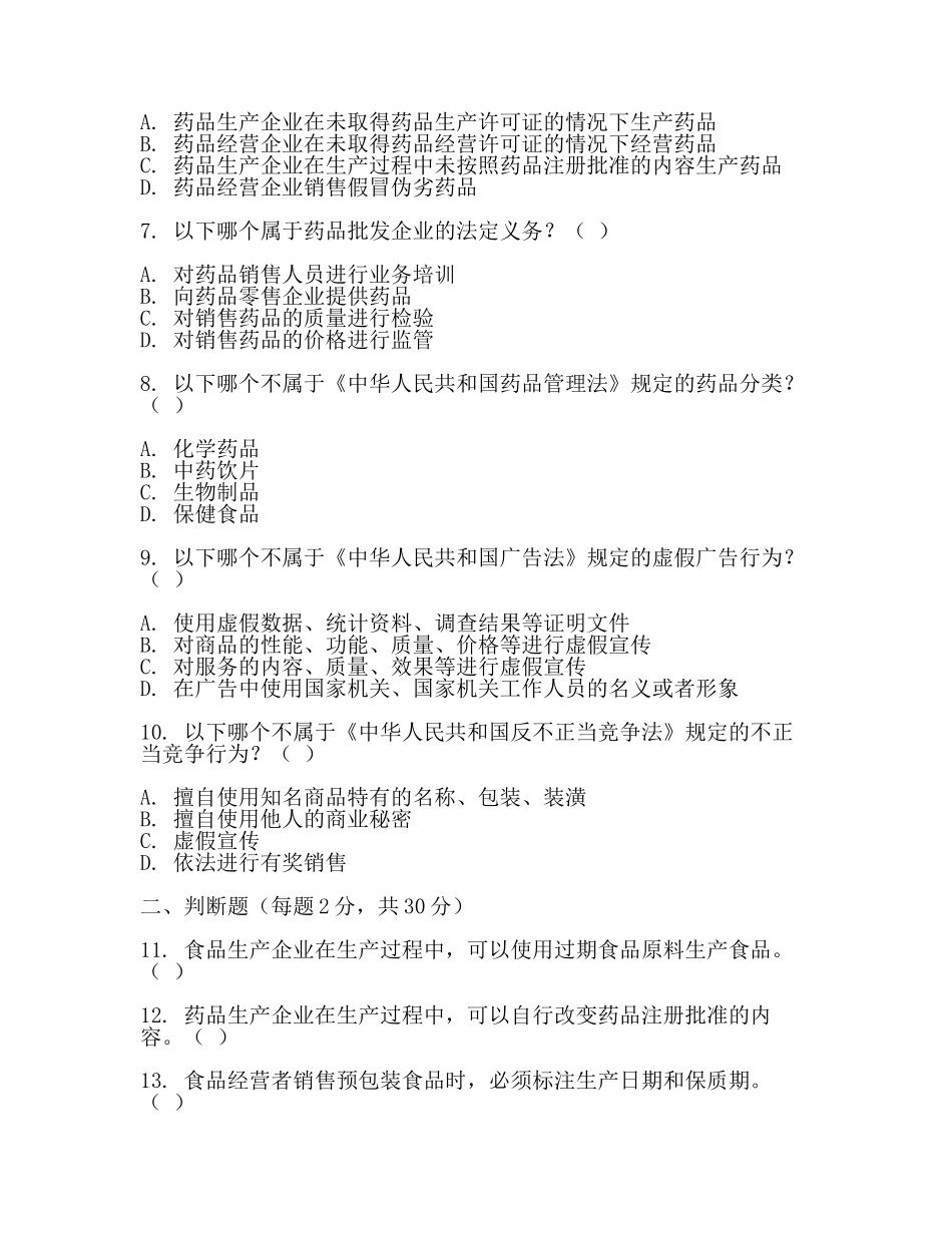 食品药品法律法规知识竞赛试题一、选择题(每题2分,共40分)1.以下哪个机构负责全国食品药品安全监督管理工作的统筹协调和指导监督?()A.市场监督管理总局B.国家卫生健康委员会C.国家食品药品监督管理局D.国家...