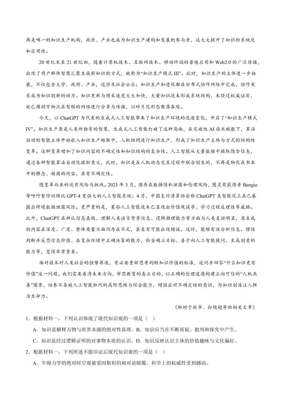 语文试题一、现代文阅读阅读下面的材料,完成下面小题。材料一知识观是人们对知识的基本看法、见解与信念,是人们对知识本质、来源、性质、标准、价值等的种种假设,是人们关于知识问题的总体认识。从历史发展进...