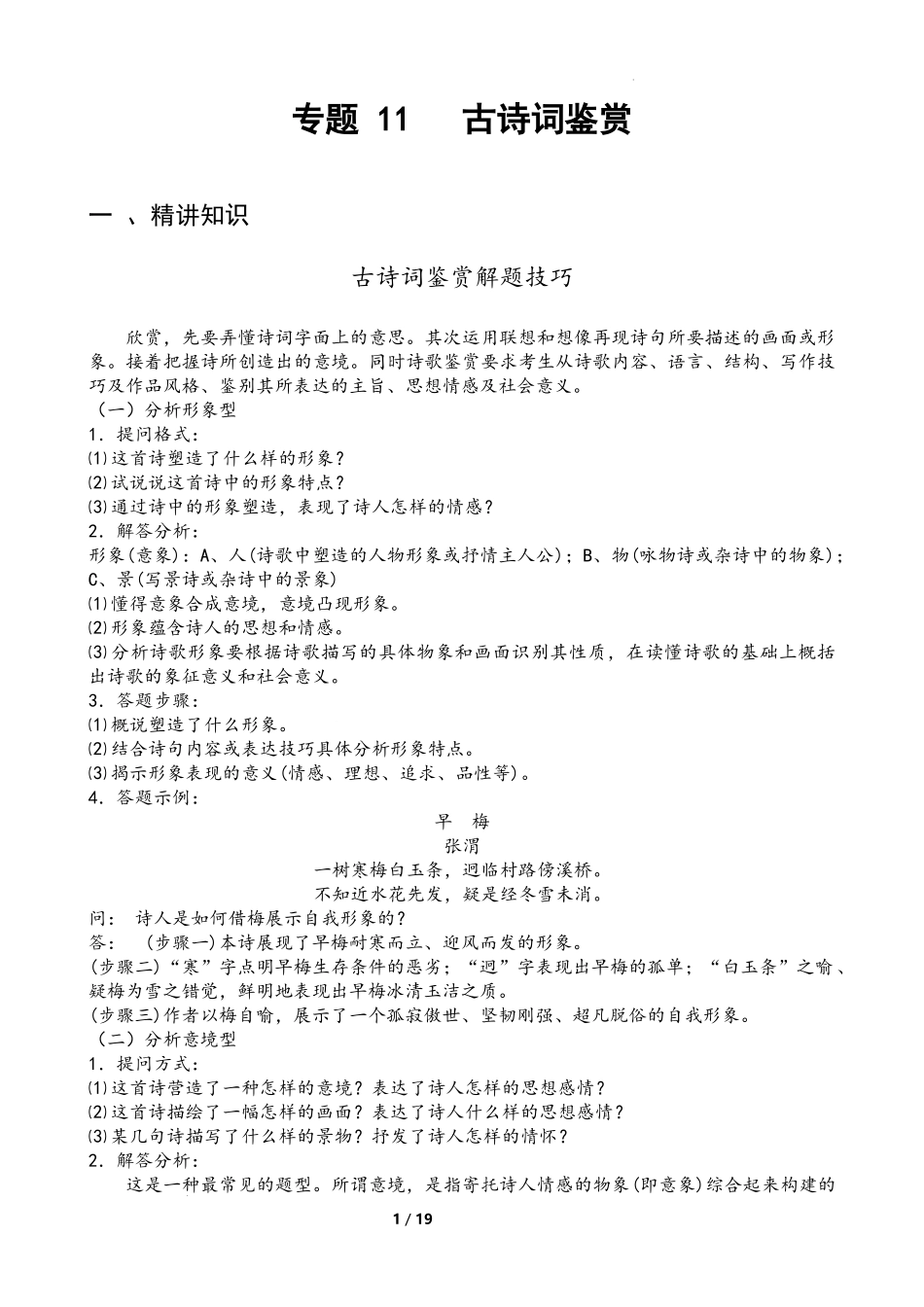 专题11古诗词鉴赏一、精讲知识古诗词鉴赏解题技巧欣赏,先要弄懂诗词字面上的意思。其次运用联想和想像再现诗句所要描述的画面或形象。接着把握诗所创造出的意境。同时诗歌鉴赏要求考生从诗歌内容、语言、结构、...