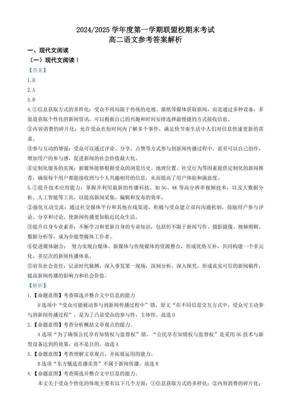 2024/2025学年度第一学期联盟校期末考试高二语文参考答案解析一、现代文阅读(一)现代文阅读Ⅰ【答案】1.D2.A3.B4.①信息获取方式的多样化:受众不再局限于传统的电视、报纸等媒体获取新闻,而是通过多种设备,...