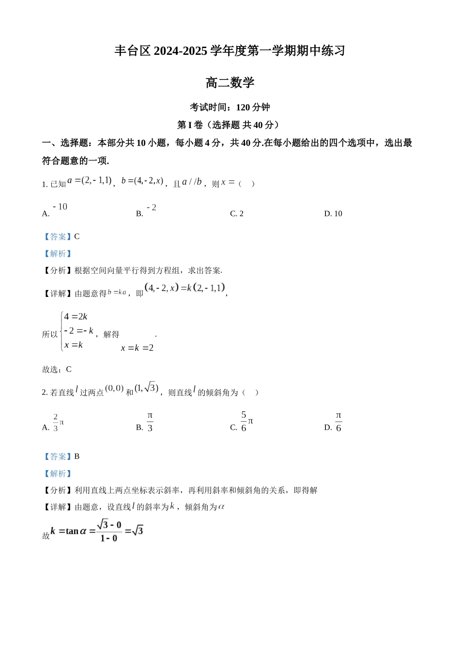 丰台区2024-2025学年度第一学期期中练习高二数学考试时间:120分钟第I卷(选择题共40分)一、选择题:本部分共10小题,每小题4分,共40分.在每小题给出的四个选项中,选出最符合题意的一项.1.已知,,且,则()A...