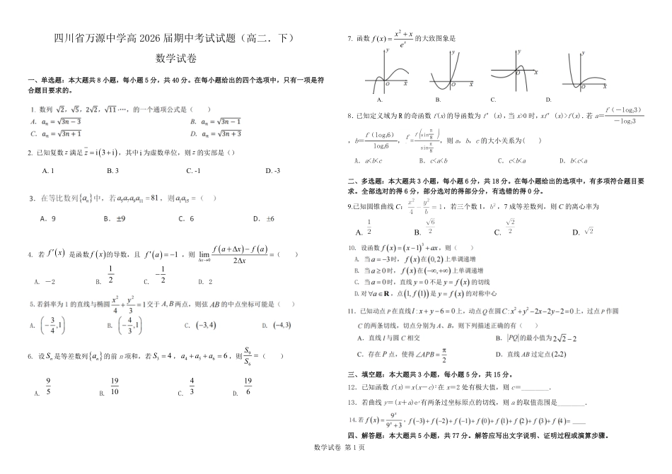 数学试卷第1页四川省万源中学高2026届期中考试试题(高二.下)数学试卷一、单选题:本大题共8小题,每小题5分,共40分。在每小题给出的四个选项中,只有一项是符合题目要求的。2.已知复数z满足i3iz=+,其中i...