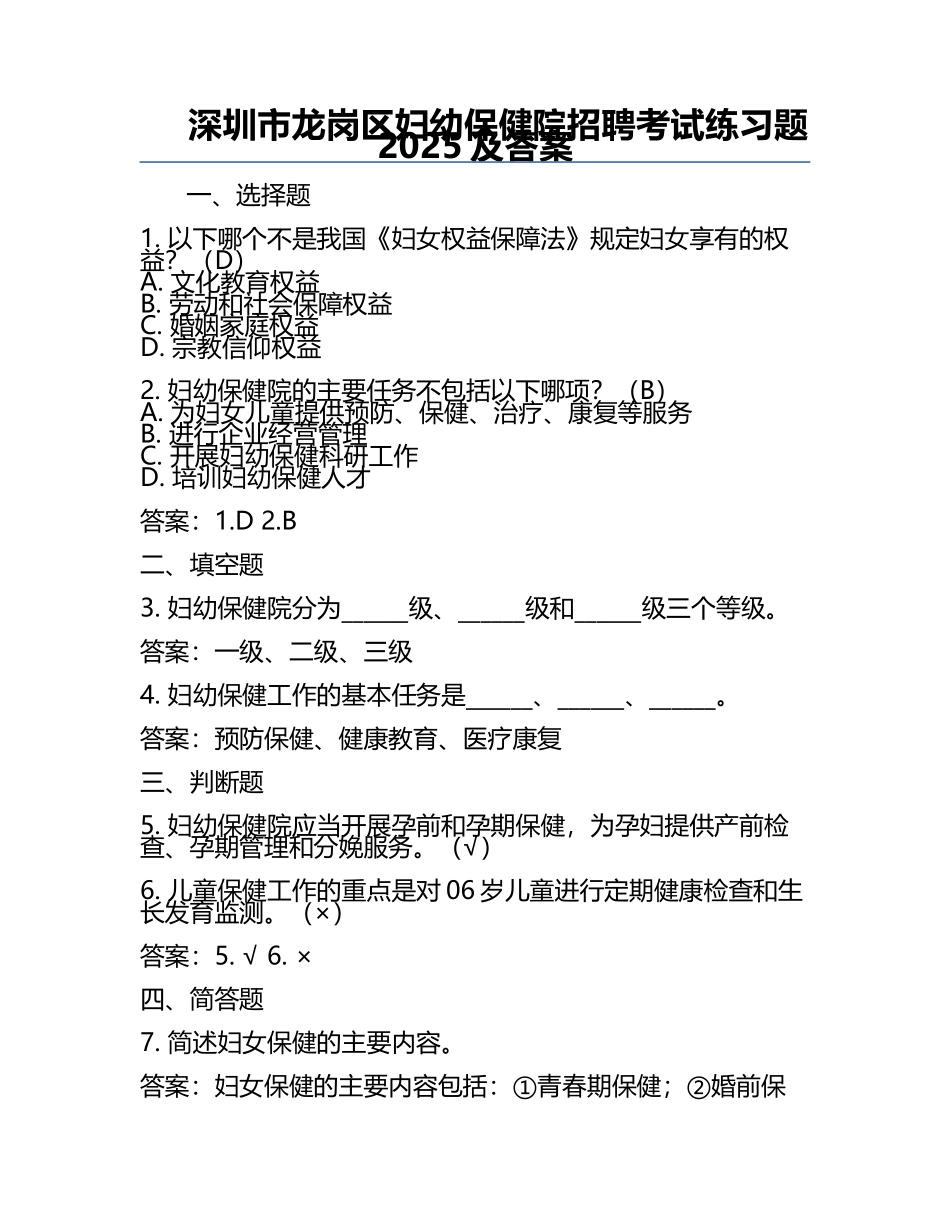 深圳市龙岗区妇幼保健院招聘考试练习题2025及答案一、选择题1.以下哪个不是我国《妇女权益保障法》规定妇女享有的权益?(D)A.文化教育权益B.劳动和社会保障权益C.婚姻家庭权益D.宗教信仰权益2.妇幼保健院的主要...