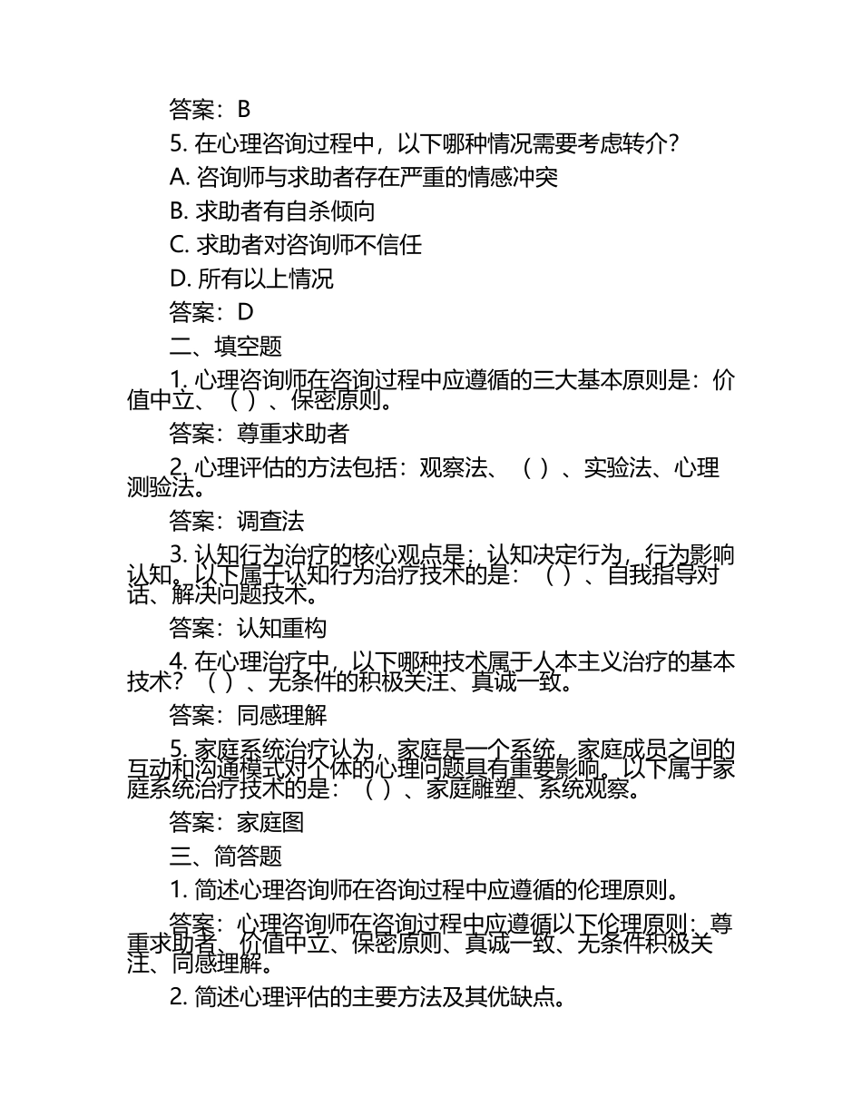 心理咨询师的学科整合试题及答案一、选择题1.心理咨询师在进行咨询时,以下哪项不是建立良好咨询关系的必要条件?A.真诚一致B.无条件积极关注C.神秘莫测D.同感理解答案:C2.在心理评估中,以下哪种方法属于投射测...